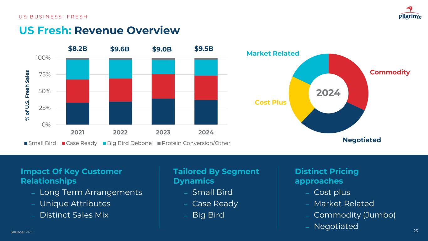 我们的美国业务概览US B US I N E S S:F R E S H 22来源:PPC $ 10.6B $ 9.5B美国销售细分增值新鲜大鸟小鸟案例准备好的蛋白质转化/其他美国生鲜销售细分按渠道划分的美国生鲜销售细分$ 9.5B零售食品服务其他出口90% 10% 53% 38% 5% 24% 37% 6% 33% 4%