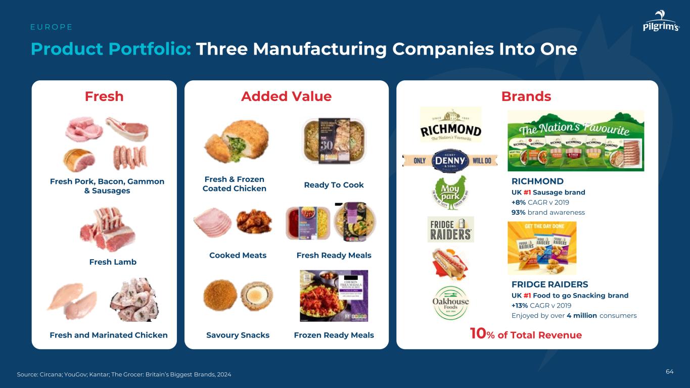 64产品组合:三家制造企业合二为一E U R O P E来源:Circana;YouGov;Kantar;The Grocer:英国最大的品牌,2024年新鲜附加值品牌Fresh & Frozen Coated Chicken Fresh Pork,Bacon,Gammon & Sausages Fresh Lamb Cooked Meats Ready to Cook Fresh Ready Meals RICHMOND UK # 1 Sausage品牌+ 8% CAGR v2019 93%品牌知名度FRIDGE RAIDERS UK # 1 Food to Go Snacking品牌+ 13% CAGR v2019年超400万消费者享受总收入的10%新鲜和腌制鸡肉咸味小吃冷冻即食餐