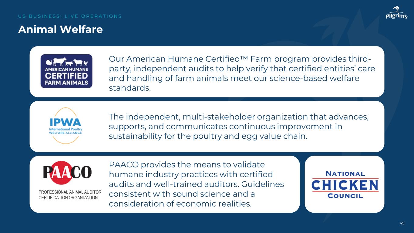 Animal Welfare US B US I N E S S:L I V E O P E R A T I O N S我们的美国人道认证农场计划提供第三方独立审计,以帮助验证认证实体对农场动物的护理和处理是否符合我们基于科学的福利标准。推动、支持和传达持续改善禽蛋价值链可持续性的独立、多方利益相关者组织。专业动物审计员认证组织PAACO提供了通过认证审计和训练有素的审计员来验证人性化行业做法的手段。与健全的科学和对经济现实的考虑相一致的指导方针。45