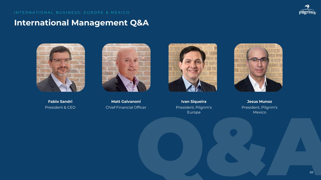 88国际管理问答I N T E R N A T I O N A L B US I N E S S:E U R O P E & M E X I C O Fabio Sandri Matt Galvanoni Ivan Siqueira Jesus Munoz总裁兼首席执行官首席财务官总裁、Pilgrim’s Europe总裁、Pilgrim’s Mexico