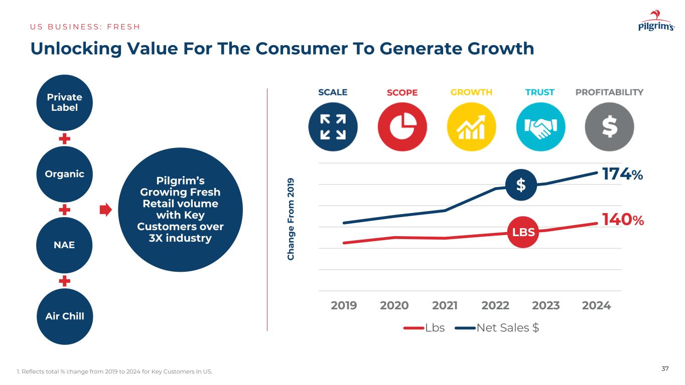 2019202020212022202220232024 LBS净销售额$解锁价值为消费者创造增长US B US I N E S S:F R E S H1。反映了美国关键客户从2019年到2024年的总%变化。自有品牌有机NAE Air Chill Pilgrim的生鲜零售量不断增长,关键客户超过3倍行业C h an g e fr om 2019140% $ LBS 174% 37