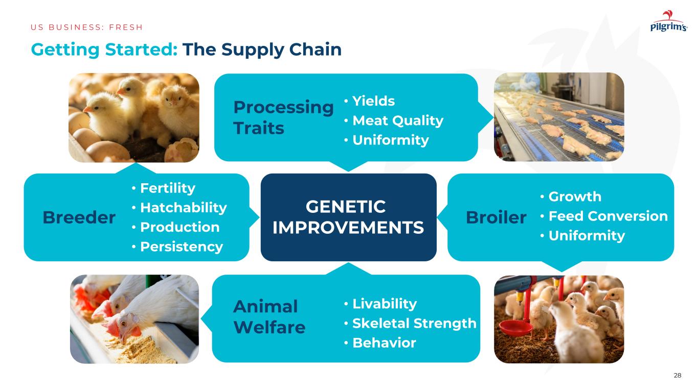 入门:供应链US B U S I N E S S:F R E S H28基因改良肉鸡加工性状•生长•饲料转换•均匀•产量•肉质•均匀动物福利•宜居性•骨骼强度•行为饲养员•生育能力•孵化性•生产•持久性