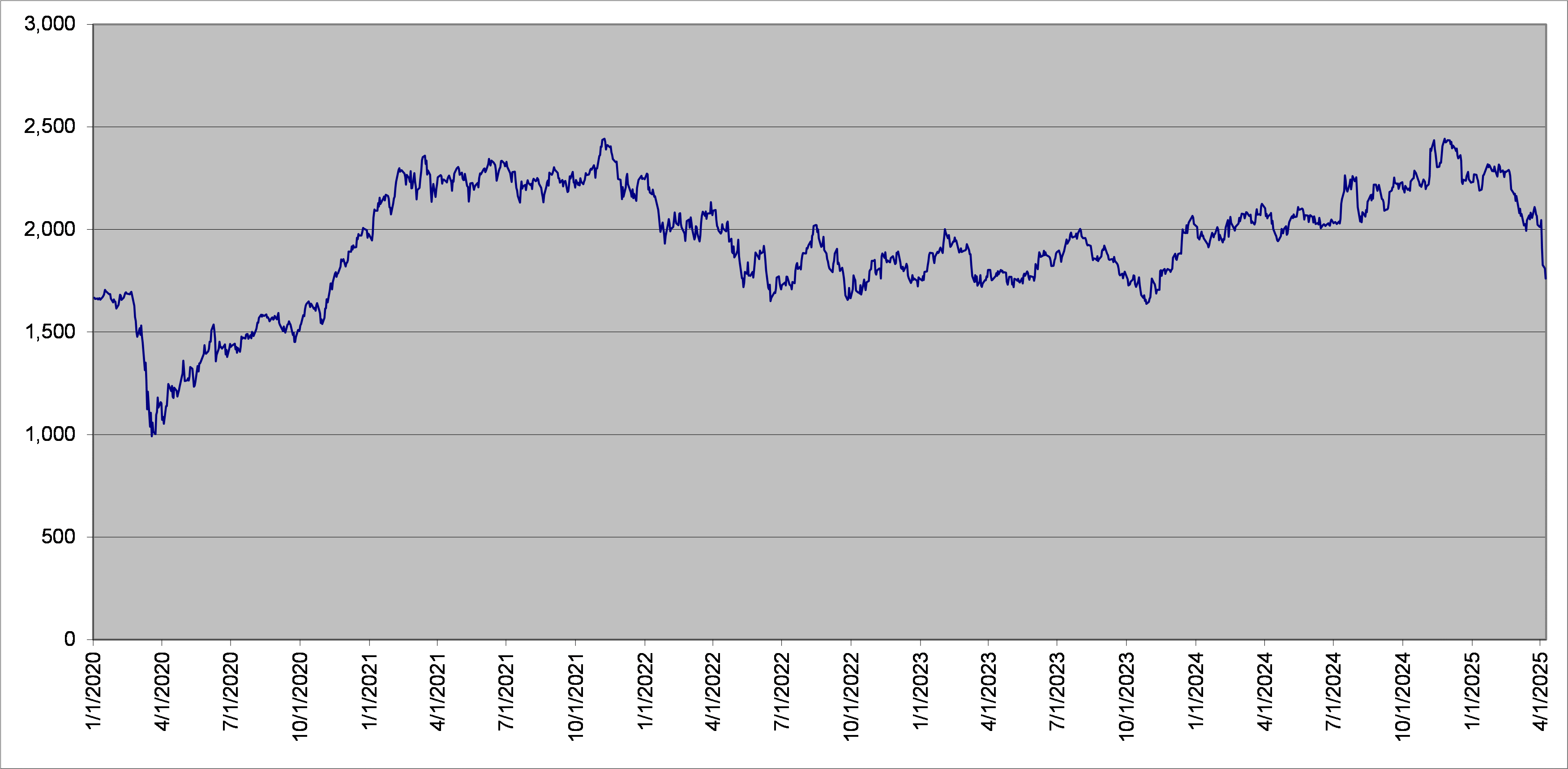 | RTY指数每日收盘水平 2020年1月1日至2025年4月8日 |