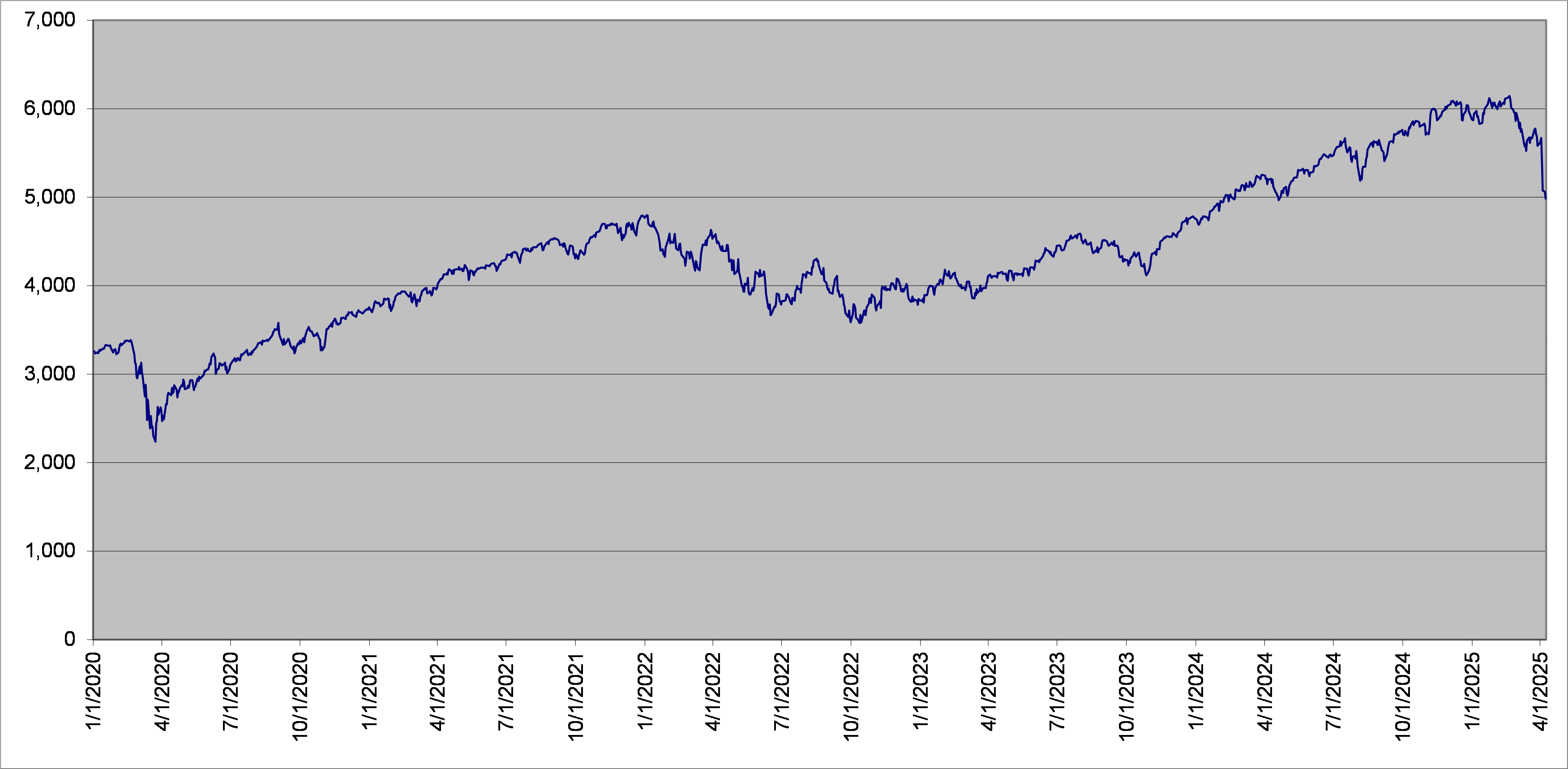 | SPX指数每日收盘水平 2020年1月1日至2025年4月8日 |