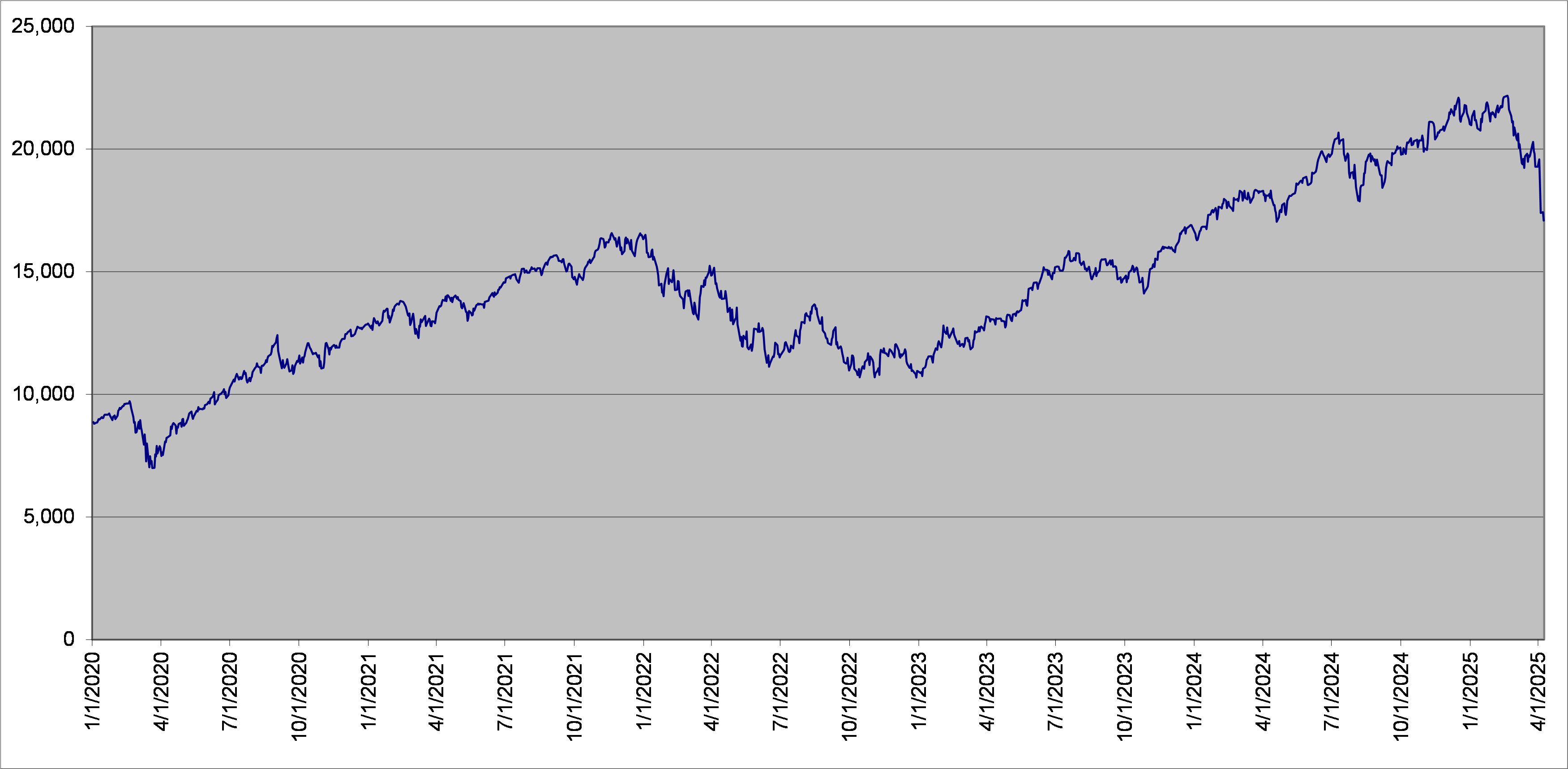| NDX指数每日收盘水平 2020年1月1日至2025年4月8日 |