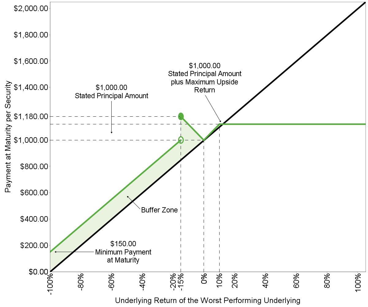 该证券对表现最差的标的的表现提供修正敞口,其中(i)有机会以下文规定的参与率参与表现最差的标的的有限范围的潜在升值,(ii)如果表现最差的标的在等于该贬值绝对值的有限范围内(不超过下文规定的缓冲百分比)贬值,则有机会在到期时获得正回报乘以参与率和(iii)对表现最差的标的超过缓冲百分比的任何贬值的有限缓冲。作为这些特征的交换,证券的投资者必须愿意放弃表现最差的标的超过下文规定的最大上行回报的任何升值,并且必须愿意放弃任何标的的任何股息。此外,证券投资者必须愿意接受表现最差的标的的任何贬值超过下文规定的缓冲百分比的下行风险敞口。如果表现最差的标的从其初始标的价值到最终标的价值的贬值幅度超过缓冲百分比,则贬值幅度超过缓冲百分比的每1%,您将损失证券规定本金金额的1%。