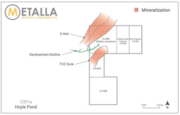 Metalla持有Discovery Silver Corporation(“Discovery Silver”)计划收购Hoyle Pond矿(“Hoyle Pond”)的部分股份的2.0%的NSR特许权使用费。
