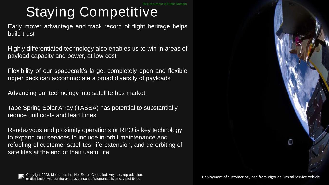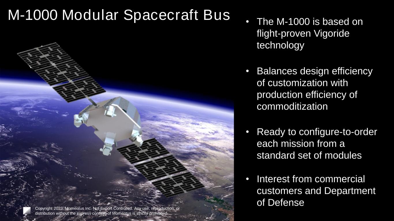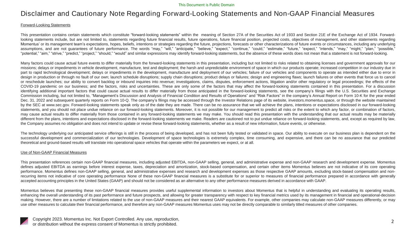 版权所有2023。Momentus Inc.不受出口管制。未经Momentus明确同意,严禁使用、复制或分发。本文件为公共领域关于前瞻性陈述和非公认会计原则财务指标前瞻性陈述的免责声明和注意事项本演示文稿包含某些陈述,这些陈述构成1933年《证券法》第27A条和1934年《交易法》第21E条含义内的“前瞻性陈述”。前瞻性陈述包括但不限于关于未来财务结果、未来业务、未来财务状况、预计费用、管理目标的陈述,以及关于Momentus或其管理团队对未来的期望、希望、信念、意图或战略的其他陈述,包括对未来事件或情况的预测、预测或其他特征,包括任何基本假设,不保证未来的业绩。“可能”、“将”、“预期”、“相信”、“预期”、“继续”、“可能”、“估计”、“未来”、“预期”、“打算”、“可能”、“可能”、“计划”、“可能”、“潜在”、“目标”、“努力”、“预测”、“项目”、“应该”、“将”和类似的表达方式可能会识别前瞻性陈述,但没有这些词语并不意味着一项陈述不具有前瞻性。许多因素可能导致实际的未来事件与本演示文稿中的前瞻性陈述存在重大差异,包括但不限于与我们的任务获得许可证和政府批准相关的风险;车辆开发、制造、测试和部署方面的延迟或障碍;我们的产品运行的空间环境恶劣且不可预测;部分由于快速的技术发展导致我们行业的竞争加剧;开发过程中的延迟或障碍,制造和部署我们的车辆;由于生产中的设计错误或没有我们自己的过错,我们的车辆和部件未能按预期运行;发射计划中断;供应链中断;产品延迟或故障;设计和工程缺陷;发射失败或其他迫使我们取消或重新安排发射的事件;我们将积压或入境查询转化为收入的能力;调查、索赔、争议、执法行动、诉讼和/或其他监管或法律程序;新冠疫情对我们业务的影响;以及因素、风险和不确定性。这些只是可能影响本演示文稿所载前瞻性陈述的一些因素。如需讨论其他可能导致实际结果与前瞻性陈述中的预期存在重大差异的重要因素,请参阅该公司提交给美国证券交易委员会的文件,包括但不限于该公司截至2022年12月31日止年度的10-K表格年度报告中的“管理层对财务状况和经营业绩的讨论与分析”和“风险因素”,以及随后的10-Q表格季度报告。该公司的文件可通过其网站Investors.momentus.space的投资者关系页面或SEC维护的网站www.sec.gov查阅。前瞻性陈述仅在发表之日起生效。我们无法保证我们将实现我们在前瞻性陈述中披露的计划、意图或期望,您不应过分依赖我们的前瞻性陈述。此外,我们的管理层不可能预测所有风险,也不可能预测任何因素或各种因素的组合在多大程度上可能导致实际结果与我们可能做出的任何前瞻性陈述中所包含的结果存在重大差异。您在阅读本演示文稿时应理解,我们的实际结果可能与我们在前瞻性陈述中披露的计划、意图和预期存在重大差异。提醒读者不要过分依赖前瞻性陈述,除法律要求外,公司不承担任何义务,也不打算更新或修改这些前瞻性陈述,无论是由于新信息、未来事件或其他原因。我们预期提供的服务所依据的技术仍在开发过程中,尚未在空间进行全面测试或验证。我们执行业务计划的能力取决于我们技术的成功开发和商业化。空间技术的开发极其复杂、耗时和昂贵,不能保证我们预测的理论和地面成果将转化为在我们期望的参数范围内运行的可操作空间飞行器, 或者根本没有。非GAAP财务指标的使用本演示文稿引用了某些非GAAP财务指标,包括调整后的EBITDA、非GAAP销售、一般管理费用和非GAAP研发费用。Momentus将调整后的EBITDA定义为扣除利息费用、税项、折旧和摊销、基于股票的补偿以及Momentus认为不能反映其核心经营业绩的某些其他项目之前的收益。Momentus将非GAAP销售、一般及管理费用和研发费用定义为相应的GAAP金额,不包括基于股票的薪酬和不代表核心经营业绩的非经常性项目。这些非GAAP财务指标都不能替代或优于根据美国公认会计原则编制的财务业绩指标,不应被视为替代根据GAAP得出的任何其他业绩指标。Momentus认为,介绍这些非公认会计原则的财务指标为投资者提供了关于Momentus的有用的补充信息,有助于理解和评估其经营业绩,加强对其过去业绩和未来前景的全面了解,并提高其管理层在财务和经营决策中使用的关键财务指标的透明度。然而,在使用非公认会计原则衡量标准及其最接近的公认会计原则对应指标方面存在一些限制。例如,其他公司可能会以不同的方式计算非GAAP指标,或者使用其他指标来计算其财务业绩,因此Momentus使用的任何非GAAP指标可能无法与其他公司类似名称的指标直接比较。2