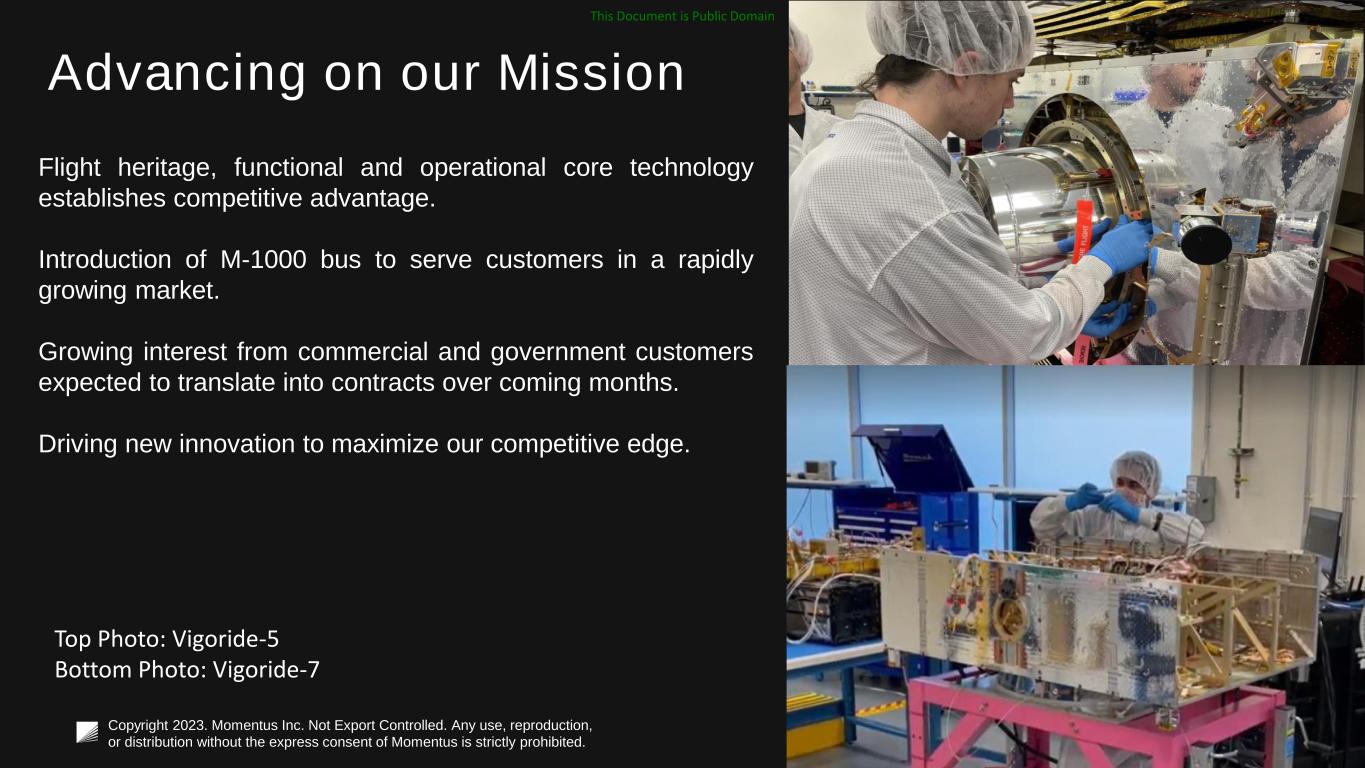 版权所有2023。Momentus Inc.不受出口管制。未经Momentus明确同意,严禁使用、复制或分发。本文件是公共领域推进我们的任务飞行遗产,功能和操作核心技术建立竞争优势。推出M-1000总线,为快速增长的市场中的客户提供服务。商业和政府客户日益增长的兴趣预计将在未来几个月转化为合同。推动新的创新,以最大限度地提高我们的竞争优势。4上图:Vigoride-5下图:Vigoride-7
