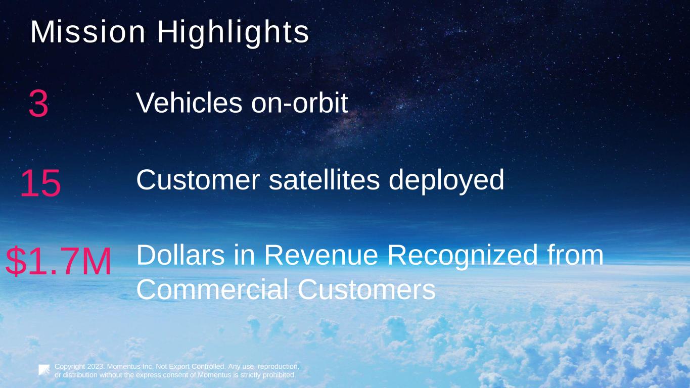 版权所有2023。Momentus Inc.不受出口管制。未经Momentus明确同意,严禁使用、复制或分发。本文件为公共领域任务亮点315辆车在轨客户卫星部署170万美元收入确认自商业客户