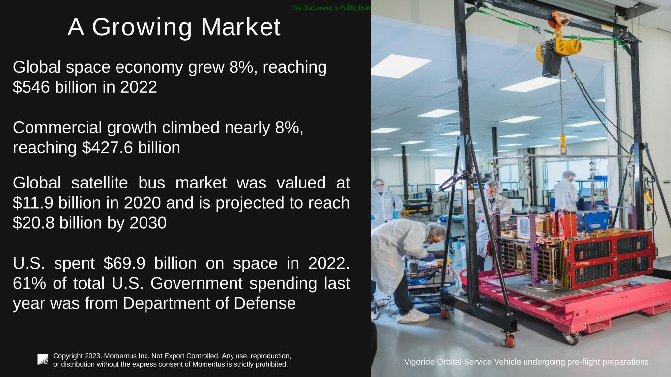 版权所有2023。Momentus Inc.不受出口管制。未经Momentus明确同意,严禁使用、复制或分发。这份文件是公共领域一个不断增长的市场10全球太空经济增长8%,2022年达到5460亿美元商业增长增长近8%,达到4276亿美元全球卫星巴士市场在2020年的价值为119亿美元,预计到2030年将达到208亿美元美国在2022年的太空支出为699亿美元。去年美国政府支出总额的61%来自正在进行飞行前准备的国防部Vigoride轨道服务飞行器