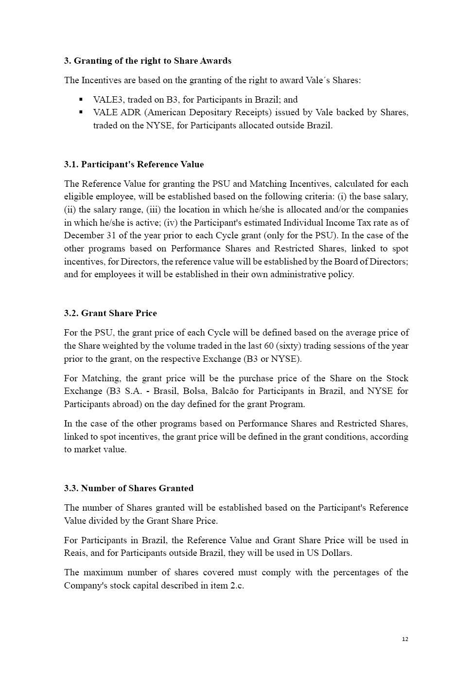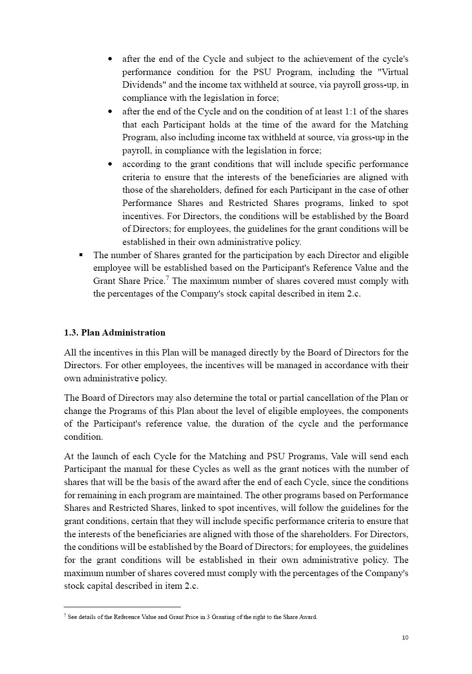 周期结束后,并在PSU计划实现周期绩效条件的前提下,包括通过工资总额预扣的“虚拟股息”和源头预扣的所得税,符合现行立法;•周期结束后,在每个参与者在匹配计划授予时持有的股份至少1:1的条件下,还包括通过工资总额预扣的源头所得税,符合现行立法;•根据将包括特定绩效标准的授予条件,确保受益人的利益与股东的利益保持一致,在其他绩效股份和限制性股票计划的情况下为每个参与者定义,与现货激励挂钩。对董事而言,条件将由董事会制定;对员工而言,授予条件的指引将在其自身的行政政策中制定。▪每位董事和合资格雇员参与的授予股份数量将根据参与者的参考价值和授予股份价格确定。7所涵盖的最高股份数量必须符合项目2.c中所述的公司股本百分比。1.3.计划管理本计划中的所有激励措施将直接由董事会对董事进行管理。对于其他员工,奖励办法将按照自己的行政管理政策进行管理。董事会还可以决定全部或部分取消该计划或更改本计划有关合格员工水平、参与者参考价值的组成部分、周期持续时间和绩效条件的计划。在匹配和PSU计划的每个周期启动时,淡水河谷将向每位参与者发送这些周期的手册以及授予通知,其中包含将在每个周期结束后作为奖励基础的股份数量,因为保留在每个计划中的条件保持不变。其他基于业绩股和限制性股票的方案,与现货激励挂钩,将遵循授予条件的指引,确定它们将包括特定的业绩标准,以确保受益人的利益与股东的利益保持一致。对董事而言,条件将由董事会制定;对员工而言,授予条件的指引将在其自身的行政政策中制定。涵盖的最大股份数量必须符合2.c项所述的公司股本百分比。7详见3授出股份奖励权利中的参考价值和授予价格。