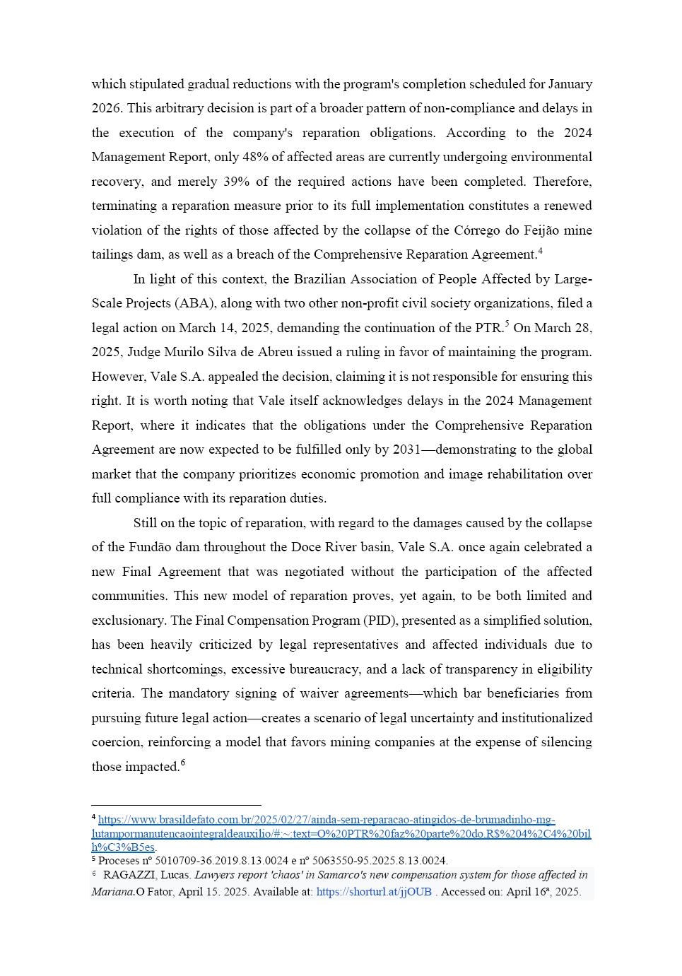 其中规定逐步削减,计划于2026年1月完成。这一武断的决定是更广泛的不遵守和延迟履行公司赔偿义务模式的一部分。根据2024年管理报告,目前只有48%的受影响地区正在进行环境恢复,仅完成了所需行动的39%。因此,在全面实施之前终止一项赔偿措施,构成对受C ó rrego do Feij ã o矿山尾矿坝坍塌影响人员权利的再次侵犯,也违反了《全面赔偿协议》。4鉴于这一背景,巴西受大型项目影响人民协会(ABA)与其他两个非营利性民间社会组织于2025年3月14日提起法律诉讼,要求继续执行PTR。5于2025年3月28日,法官Murilo Silva de Abreu发布了一项有利于维持该计划的裁决。不过,淡水河谷公司对该决定提出上诉,称其不负责确保这一权利。值得注意的是,淡水河谷本身也承认2024年管理报告中的延迟,其中指出,现在预计《全面赔偿协议》下的义务只能在2031年之前得到履行——这向全球市场表明,该公司优先考虑经济促进和形象恢复,而不是完全遵守其赔偿义务。仍然是关于赔偿的话题,关于Fund ã o大坝在Doce河整个流域坍塌造成的损失,淡水河谷公司再次庆祝了一项新的最终协议,该协议是在没有受影响社区参与的情况下通过谈判达成的。这种新的赔偿模式再次证明,它既是有限的,也是排他性的。作为简化解决方案提出的最终赔偿计划(PID),由于技术缺陷、过度官僚主义以及资格标准缺乏透明度,一直受到法律代表和受影响个人的严厉批评。强制签署豁免协议——禁止受益人在未来采取法律行动——造成了一种法律不确定性和制度化强制的情景,强化了一种有利于矿业公司的模式,而牺牲了让受影响者沉默的代价。64 https://www.brasildefato.com/2025/02/27/ainda-sem-reparacao-atingidos-de-brumadinho-mglutampormanutencaointegraldeauxilio/#:~:text = o%20PTR%20faz%20parte%20do,R $% 204% 2C4 % 20bil h % C3 % B5es。5个过程n º 5010709-36.2019.8.13.0024 e n º 5063550-95.2025.8.13.0024。6拉加兹,卢卡斯。律师报告称,Samarco对马里亚纳受影响者的新赔偿制度存在“混乱”。OFATO4月15日电。2025.可查阅:https://shorturl.at/jjOUB。访问日期:2025年4月16日。