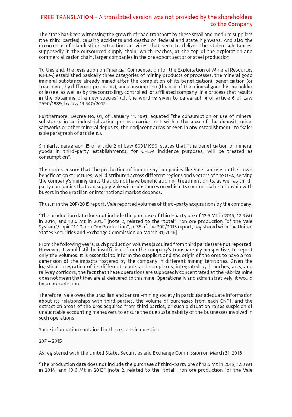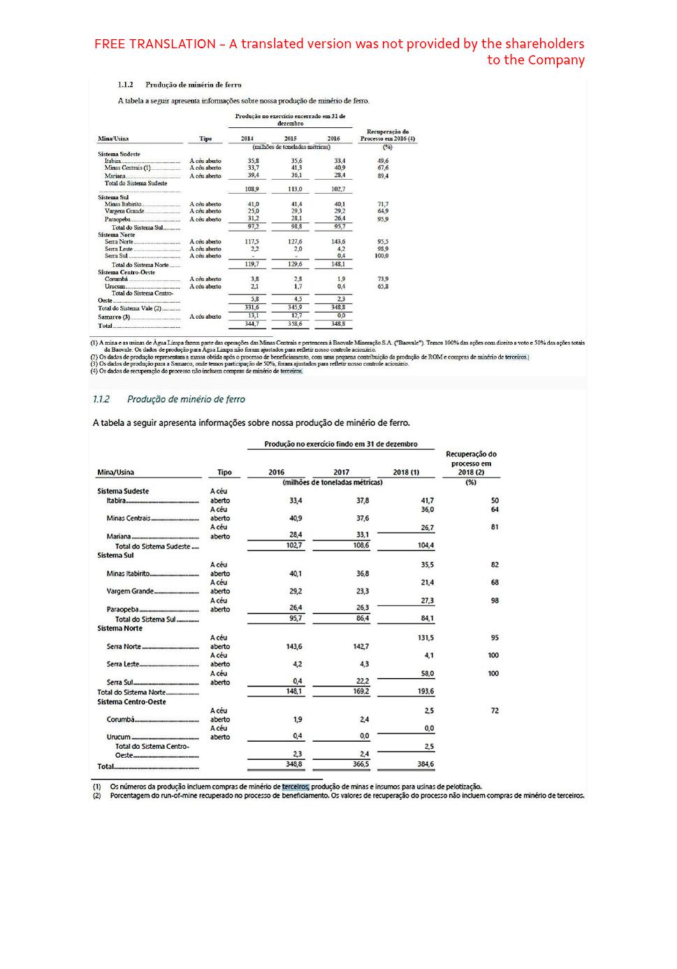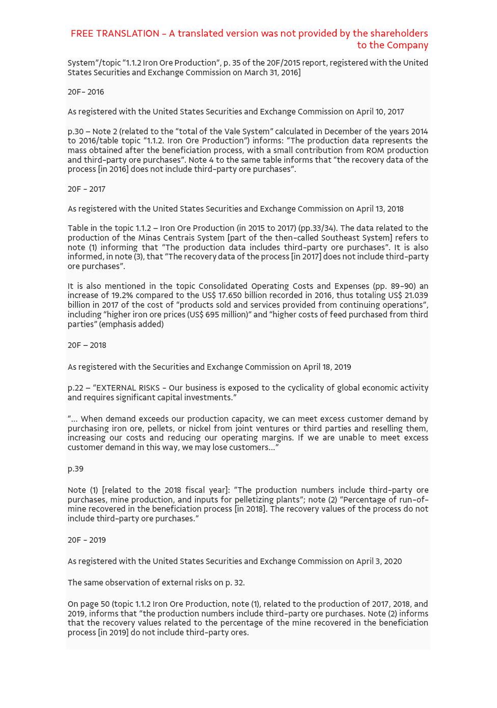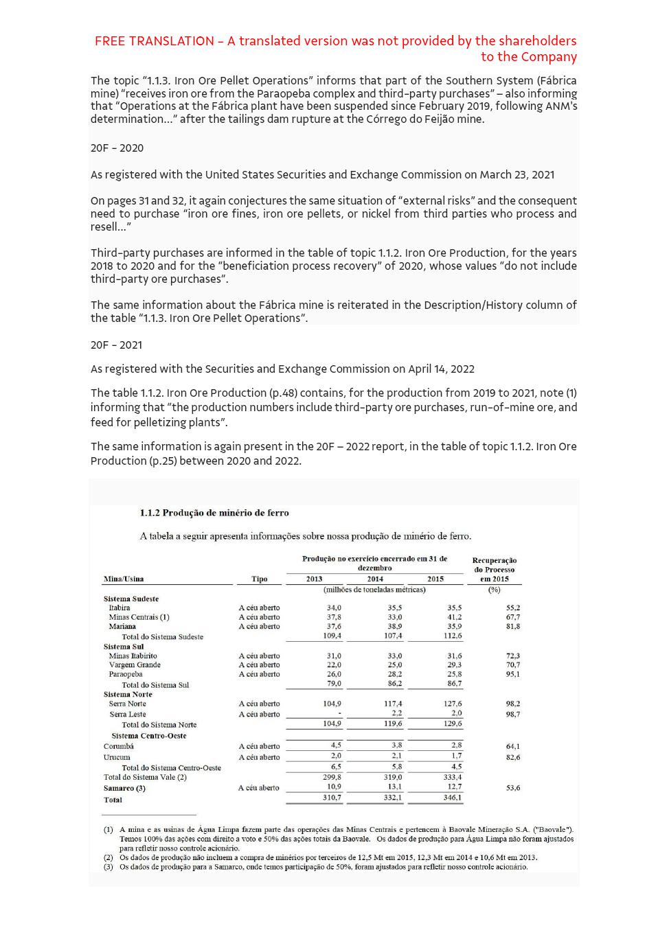 免费翻译-股东未向公司提供翻译版本主题“1.1.3。铁矿石球团业务”通知称,部分Southern System(F á brica矿)“从Paraopeba综合体和第三方采购中接收铁矿石”——还通知称,在C ó rrego do Feij ã o矿的尾矿坝破裂后,“F á brica工厂的业务自2019年2月以来已暂停,根据ANM的确定......”。20F-2020正如2021年3月23日在美国证券交易委员会登记的第31页和第32页,它再次推测出“外部风险”的相同情况,以及由此需要从加工和转售的第三方购买“铁矿石粉、铁矿石球团或镍.....。”第三方采购见专题1.1.2表格。铁矿石产量,2018年至2020年和2020年的“选矿过程回收”,其价值“不包括第三方矿石采购”。关于F á brica矿的相同信息在表“1.1.3”的Description/History栏中重申。铁矿石球团作业”。20F-2021于2022年4月14日在美国证券交易委员会登记的表格1.1.2。铁矿石生产(p.48)包含,对于2019年至2021年的生产,注(1)通知“生产编号包括第三方矿石采购、原矿矿石、球团厂进料”。同样的信息再次出现在20F – 2022报告中,在主题1.1.2的表格中。2020-2022年期间的铁矿石产量(p.25)。