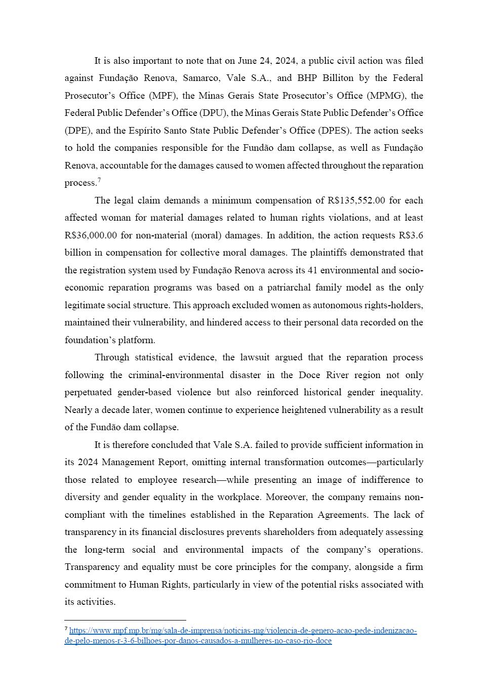 还需要注意的是,2024年6月24日,美国联邦检察官办公室(MPF)、米纳斯吉拉斯州检察官办公室(MPMG)、联邦公设辩护人办公室(DPU)、米纳斯吉拉斯州公设辩护人办公室(DPE)和圣埃斯皮里图州公设辩护人办公室(DPES)对Funda çã o Renova、Samarco、淡水河谷公司、BHP Billiton提起了公共民事诉讼。该诉讼寻求追究Fund ã o大坝坍塌事件的责任公司以及Funda çã o Renova对在整个赔偿过程中对受影响妇女造成的损害负责。7法律索赔要求对每位受影响妇女因与侵犯人权有关的物质损害赔偿最低135,552.00雷亚尔,对非物质(精神)损害赔偿至少36,000.00雷亚尔。此外,该行动要求对集体精神损害赔偿36亿雷亚尔。原告证明,Funda çã o Renova在其41个环境和社会经济赔偿项目中使用的登记制度是基于作为唯一合法社会结构的重男轻女家庭模式。这种做法将妇女排除在自主权利持有者之外,保持了她们的脆弱性,并阻碍了对基金会平台上记录的个人数据的访问。通过统计证据,该诉讼辩称,Doce河地区刑事环境灾难之后的赔偿过程不仅延续了基于性别的暴力,而且还强化了历史上的性别不平等。近十年后,由于Fund ã o大坝倒塌,妇女继续经历更高的脆弱性。因此得出的结论是,淡水河谷公司未能在其2024年管理报告中提供足够的信息,遗漏了内部转型成果——尤其是与员工研究相关的成果——同时在工作场所呈现出对多样性和性别平等漠不关心的形象。此外,该公司仍未遵守赔偿协议中规定的时间表。其财务披露缺乏透明度,使股东无法充分评估公司运营的长期社会和环境影响。透明度和平等必须是公司的核心原则,同时还必须坚定地致力于人权,特别是考虑到与其活动相关的潜在风险。7 https://www.mpf.mp.br/mG/sala-de-imprensa/noticias-mg/violencia-de-genero-acao-pede-indenizacaode-pelo-menos-r-3-6-bilhoes-por-danos-causados-a-mulheres-no-caso-rio-doce