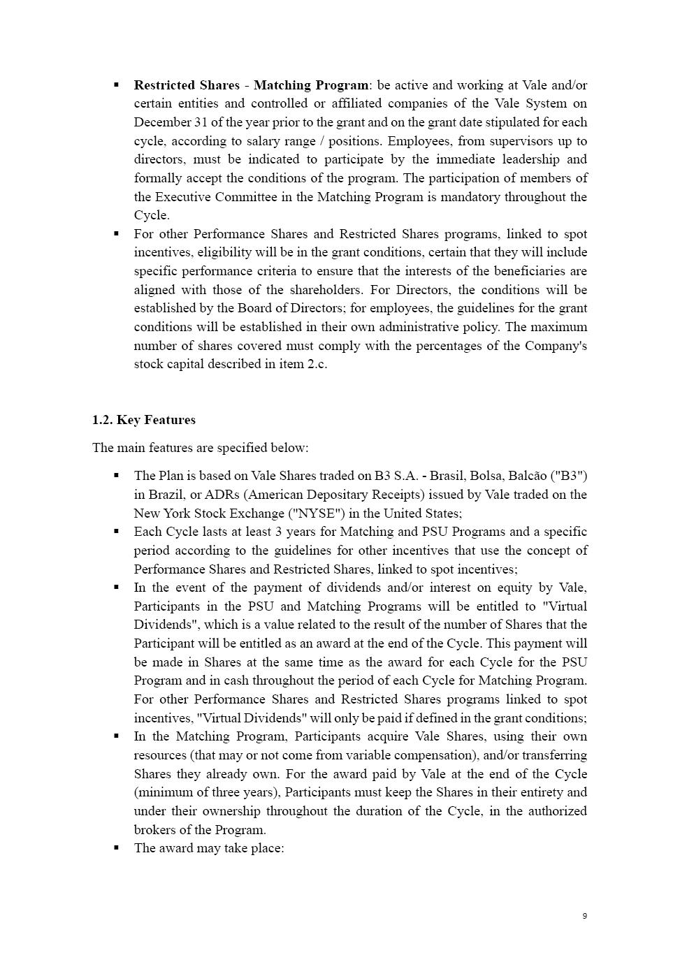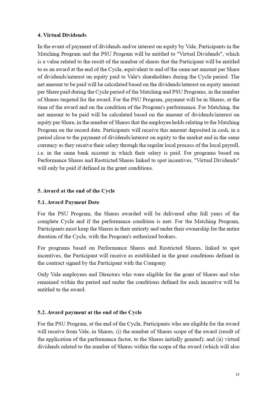 4.虚拟股息在淡水河谷支付股息和/或股权利息的情况下,匹配计划和PSU计划的参与者将有权获得“虚拟股息”,这是一个与参与者在周期结束时作为奖励将有权获得的股份数量相关的价值,相当于并且与周期期间支付给淡水河谷股东的股息/股权利息的每股净额相同。将支付的净额将根据在匹配和PSU计划的周期期间支付的每股股息/权益金额计算,以奖励的目标股份数量计算。对于PSU计划,将以股份支付,在授予时并以该计划的绩效为条件。为匹配,将支付的净额将根据每股股息/权益的金额,以员工在记录日期持有的与匹配计划相关的股份数量计算。参与者将收到以现金形式存入的这笔款项,期限接近向市场支付股息/股权利息,并与他们通过当地工资单的常规当地流程(即在支付其工资的同一银行账户)领取工资的货币相同。对于基于业绩股和与现货激励挂钩的限制性股票的方案,只有在授予条件中有定义的情况下,才会支付“虚拟股息”。5.周期5.1结束时获奖。PSU计划的奖励支付日期,奖励的股份将在完整周期满几年后交付,如果满足业绩条件。对于匹配计划,参与者必须在整个周期期间与该计划的授权经纪人一起将股份全部保留并归其所有。对于以业绩份额和限制性股票为基础、与现货激励挂钩的计划,参与者将获得参与者与公司签署的合同中定义的授予条件中确定的。只有有资格获得股票授予的淡水河谷员工和董事,并且在每项激励规定的期限内和条件下,才有权获得奖励。5.2.PSU计划周期结束时的奖励付款,在周期结束时,有资格获得奖励的参与者将从淡水河谷获得股份,(i)奖励范围的股份数量(应用业绩因素的结果,对最初授予的股份);(ii)与奖励范围内的股份数量相关的虚拟股息(这也将