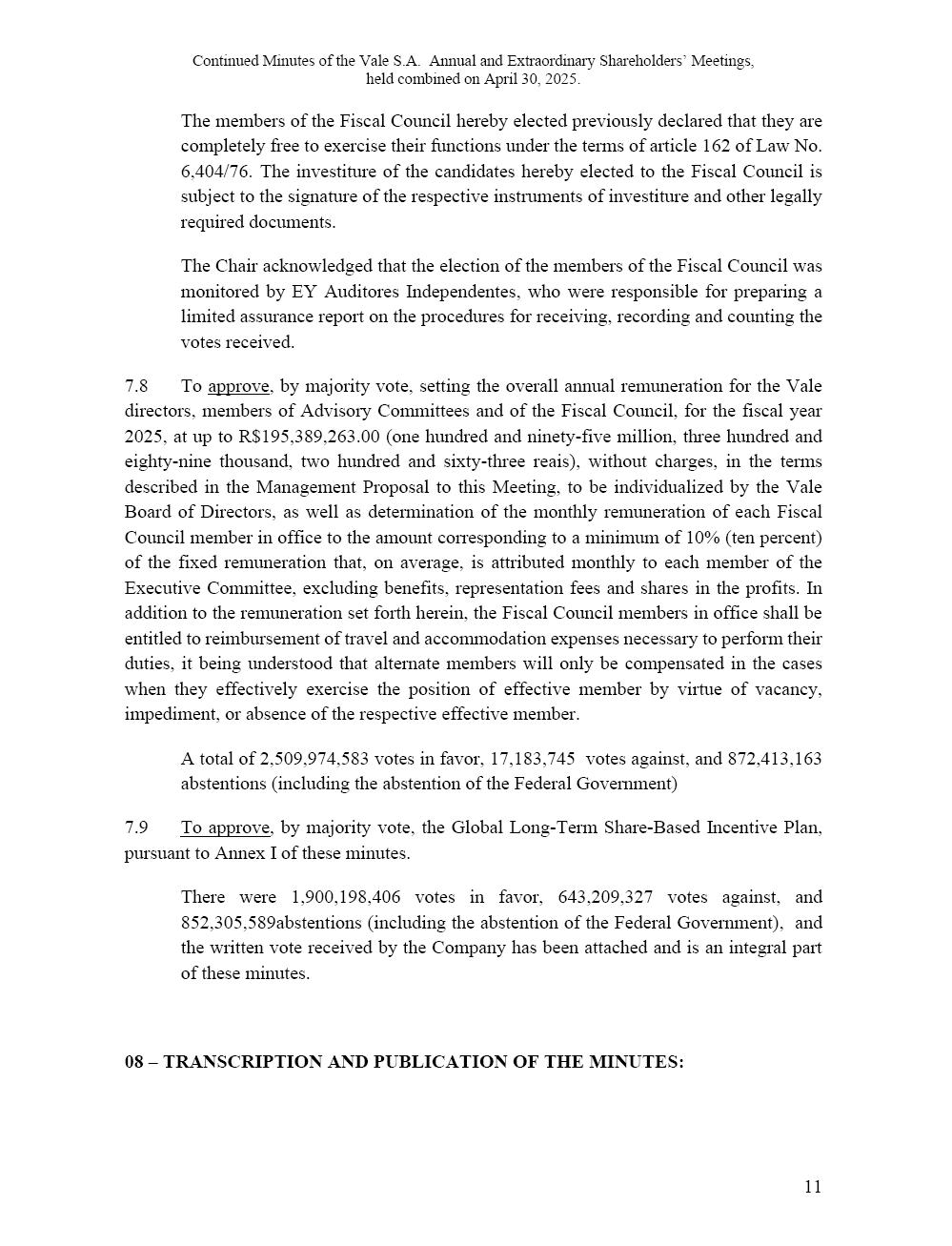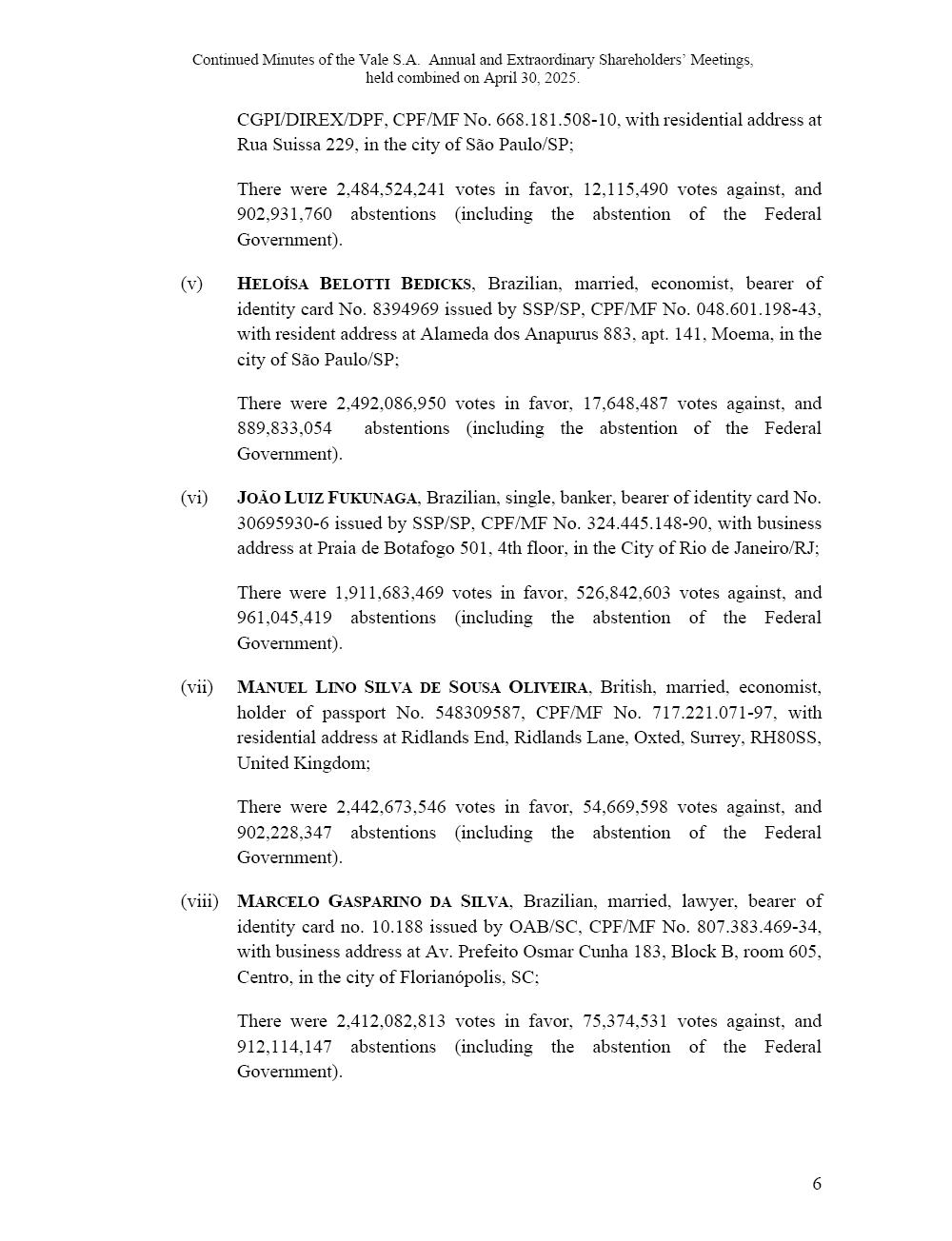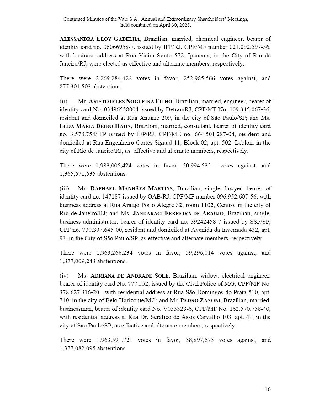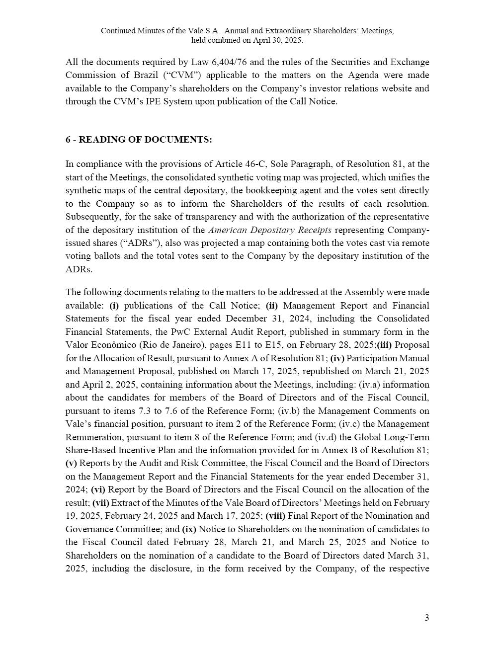 续2025年4月30日合并召开的淡水河谷公司年度股东大会及临时股东大会会议记录。3第6,404/76号法律和适用于议程上事项的巴西证券交易委员会(“CVM”)规则要求的所有文件均已在召集通知发布时通过公司投资者关系网站和CVM的IPE系统提供给公司股东。6-阅读文件:根据第81号决议第46-C条唯一款的规定,在会议开始时投射综合合成投票地图,将中央存托人、簿记代理人和直接发送给公司的投票的合成地图统一起来,以便将每项决议的结果告知股东。随后,为了透明起见,并经代表公司已发行股份(“ADR”)的美国存托凭证存托机构代表授权,还投影了一张地图,其中既包含通过远程投票投票投出的选票,也包含ADR存托机构发送给公司的总票数。提供了与大会将处理的事项有关的以下文件:(i)《呼吁通知》的出版物;(ii)截至2024年12月31日的财政年度的管理报告和财务报表,包括合并财务报表、普华永道外部审计报告,于2025年2月28日在Valor Econ ô mico(Rio de Janeiro)第E11至E15页以摘要形式公布;(iii)根据第81号决议附件A提出的结果分配提案;(iv)《参与手册》和《管理提案》,于2025年3月17日发布,于2025年3月21日和2025年4月2日重新发布,包含有关会议的信息,包括:(iv.a)根据参考表格项目7.3至7.6提供的关于董事会和财政委员会成员候选人的信息;(iv.b)管理层根据参考表格项目2对淡水河谷财务状况的评论;(iv.c)管理层薪酬,根据参考表格项目8提供;(iv.d)全球长期股权激励计划和第81号决议附件B提供的信息;(v)审计和风险委员会的报告,财政委员会和董事会关于截至2024年12月31日止年度的管理报告和财务报表;(vi)董事会和财政委员会关于分配结果的报告;(vii)2025年2月19日、2025年2月24日和2025年3月17日举行的淡水河谷董事会会议纪要摘录;(viii)提名和治理委员会的最后报告;以及(ix)2月28日、3月21日和3月25日就提名财政委员会候选人向股东发出的通知,2025年及于2025年3月31日就提名一名董事会候选人致股东的通知,包括以公司收到的表格披露有关