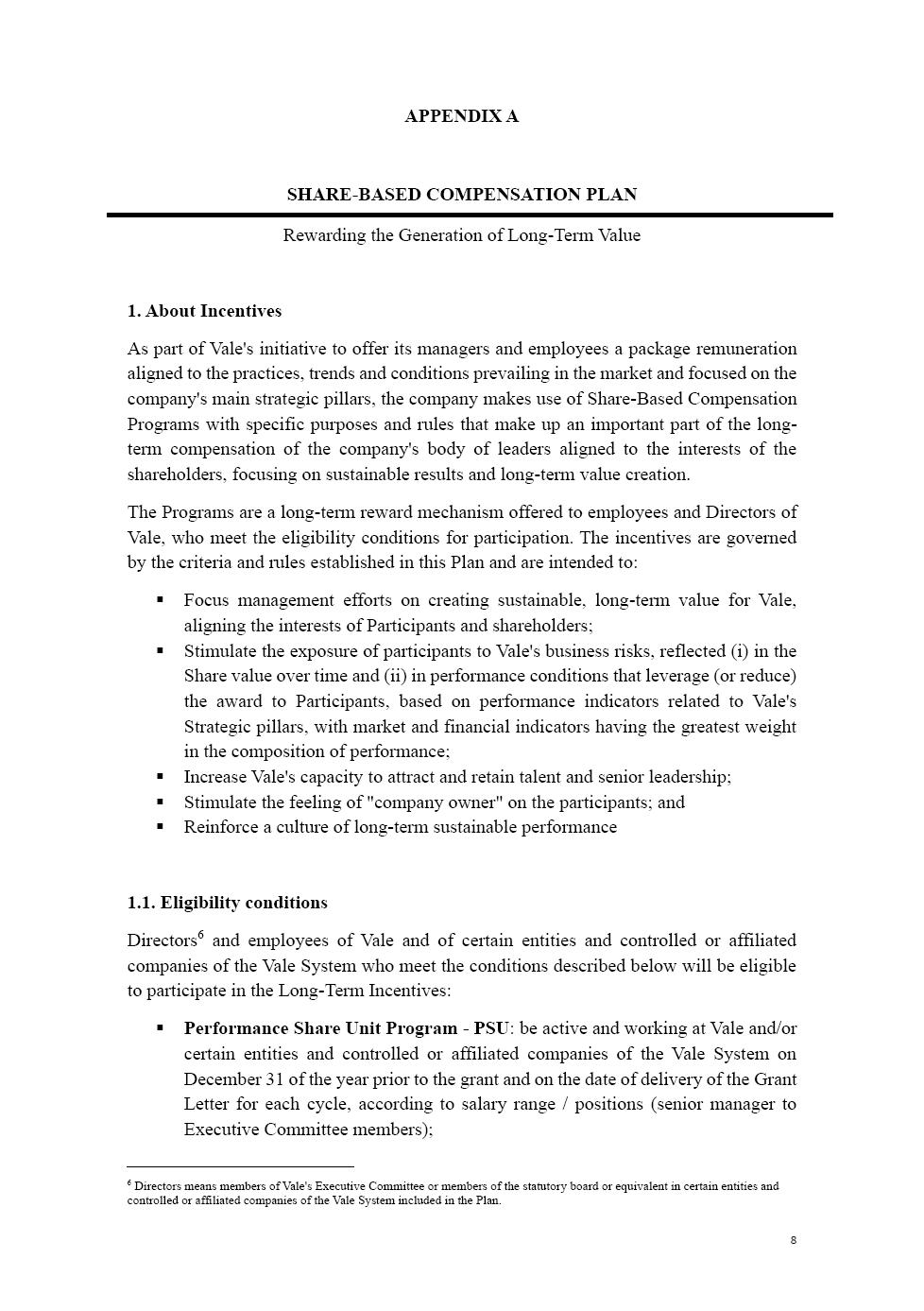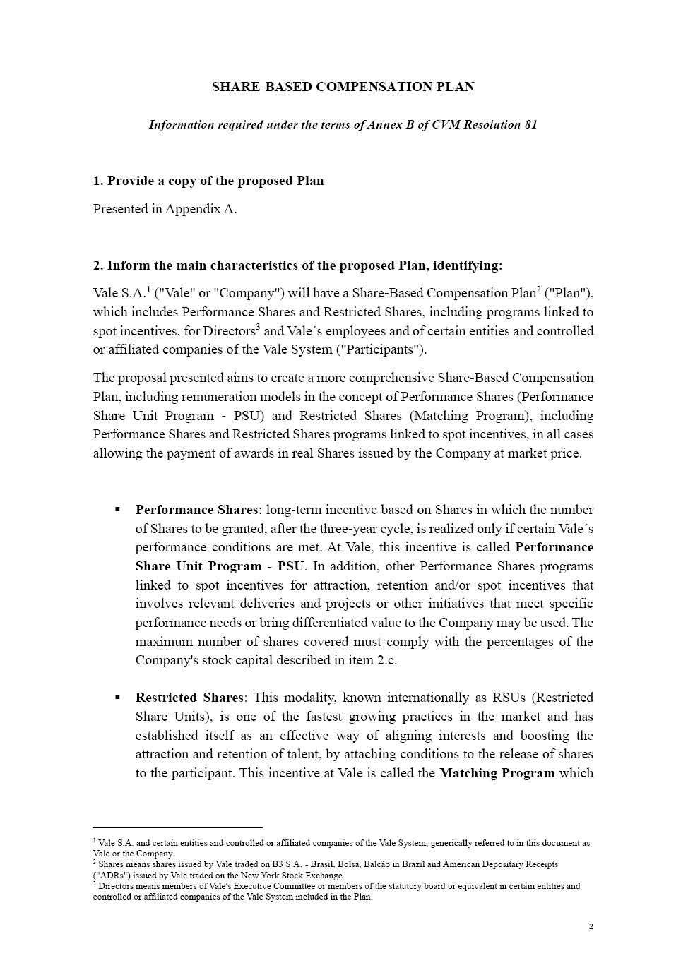 CVM第81号决议附件B条款要求的基于股份的薪酬计划信息1。提供附录A.2中提出的拟议计划的副本。告知拟议计划的主要特征,确定:淡水河谷S.A.1(“淡水河谷”或“公司”)将有一个基于股份的薪酬计划2(“计划”),其中包括针对董事3和淡水河谷员工以及淡水河谷系统的某些实体和控股或关联公司(“参与者”)的绩效股份和限制性股份,包括与现货激励相关的计划。提出的提案旨在创建一个更全面的基于股份的薪酬计划,包括绩效股份概念中的薪酬模式(绩效股份单位计划-PSU)和限制性股票(匹配计划),包括绩效股份和与现货激励挂钩的限制性股票计划,在所有情况下都允许以市场价格以公司发行的真实股份支付奖励。▪业绩股:以拟授予股份数量为基础的股份为基础的长期激励,在三年周期后,只有在满足特定淡水河谷业绩条件的情况下才能实现。在淡水河谷,这种激励被称为绩效份额单位计划-PSU。此外,可能会使用与吸引、保留和/或现货激励相关的其他绩效份额计划,这些计划涉及相关交付和项目或其他满足特定绩效需求或为公司带来差异化价值的举措。涵盖的最大股份数量必须符合2.c项所述的公司股本百分比。▪限制性股票:这种模式在国际上被称为RSU(限制性股票单位),是市场上增长最快的做法之一,并已确立为一种有效的方式,通过对参与者的股份释放附加条件,以协调利益并促进吸引和留住人才。淡水河谷的这一激励措施被称为匹配计划,1 淡水河谷公司与淡水河谷系统的某些实体和控制或关联公司,在本文件中一般称为淡水河谷或公司。2股股份指淡水河谷在巴西B3 S.A.-Brasil、Bolsa、Balc ã o交易的已发行股份以及淡水河谷在纽约证券交易所交易的已发行美国存托凭证(“ADR”)。3名董事指淡水河谷执行委员会成员或法定董事会成员或计划中包含的淡水河谷系统某些实体和受控或关联公司的同等人员。