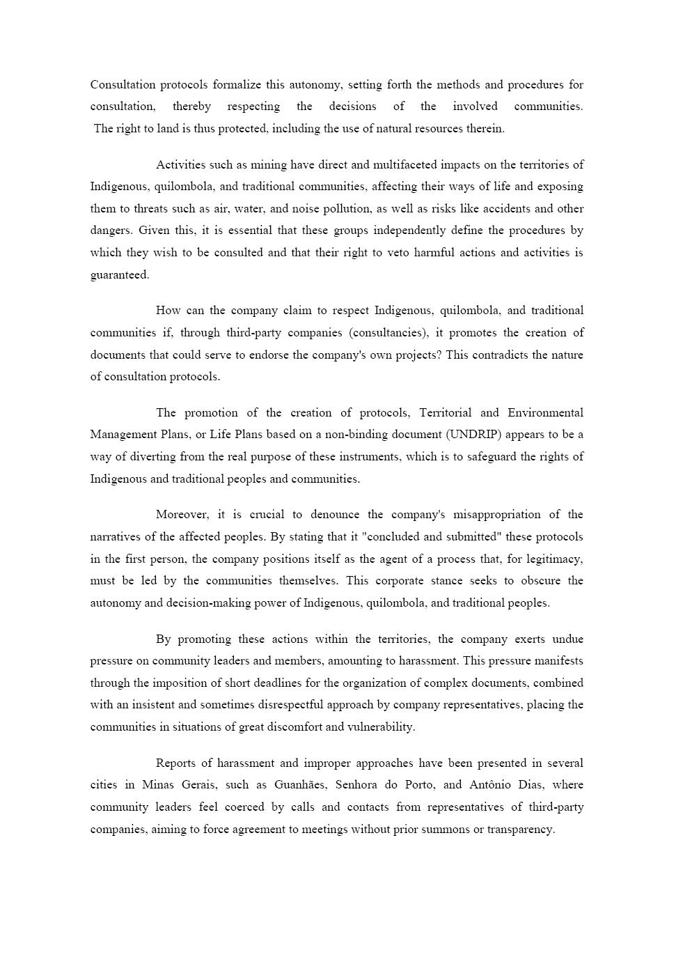 协商协议将这种自主权正式化,规定了协商的方法和程序,从而尊重相关社区的决定。因此,土地权得到保护,包括其中自然资源的使用。采矿等活动对土著、quilombola和传统社区的领土产生了直接和多方面的影响,影响了他们的生活方式,使他们面临空气、水和噪音污染等威胁,以及事故和其他危险等风险。有鉴于此,至关重要的是,这些团体必须独立界定他们希望被征询意见的程序,并保证他们否决有害行动和活动的权利。如果公司通过第三方公司(咨询公司)推动创建可用于为公司自身项目背书的文件,该公司如何声称尊重土著、quilombola和传统社区?这与磋商协议的性质相矛盾。推动根据不具约束力的文件(UNDRIP)制定议定书、领土和环境管理计划或生活计划,似乎是偏离这些文书真正目的的一种方式,即维护土著和传统民族和社区的权利。此外,谴责该公司盗用受影响人民的叙述至关重要。通过声明以第一人称“完成并提交”这些协议,该公司将自己定位为一个过程的代理人,为了合法性,这个过程必须由社区自己领导。这种公司立场试图掩盖土着、quilombola和传统民族的自主权和决策权。该公司通过在领土内推动这些行动,对社区领导人和成员施加了不应有的压力,相当于骚扰。这种压力表现为对复杂文件的组织规定了较短的最后期限,再加上公司代表坚持、有时甚至是不尊重的做法,使社区处于非常不舒服和脆弱的境地。米纳斯吉拉斯州的几个城市,如Guanh ã es、Senhora do Porto和Ant ô nio Dias,都出现了骚扰和不当做法的报告,在这些城市,社区领导人感到受到来自第三方公司代表的电话和联系的胁迫,旨在迫使同意在没有事先传唤或透明度的情况下举行会议。