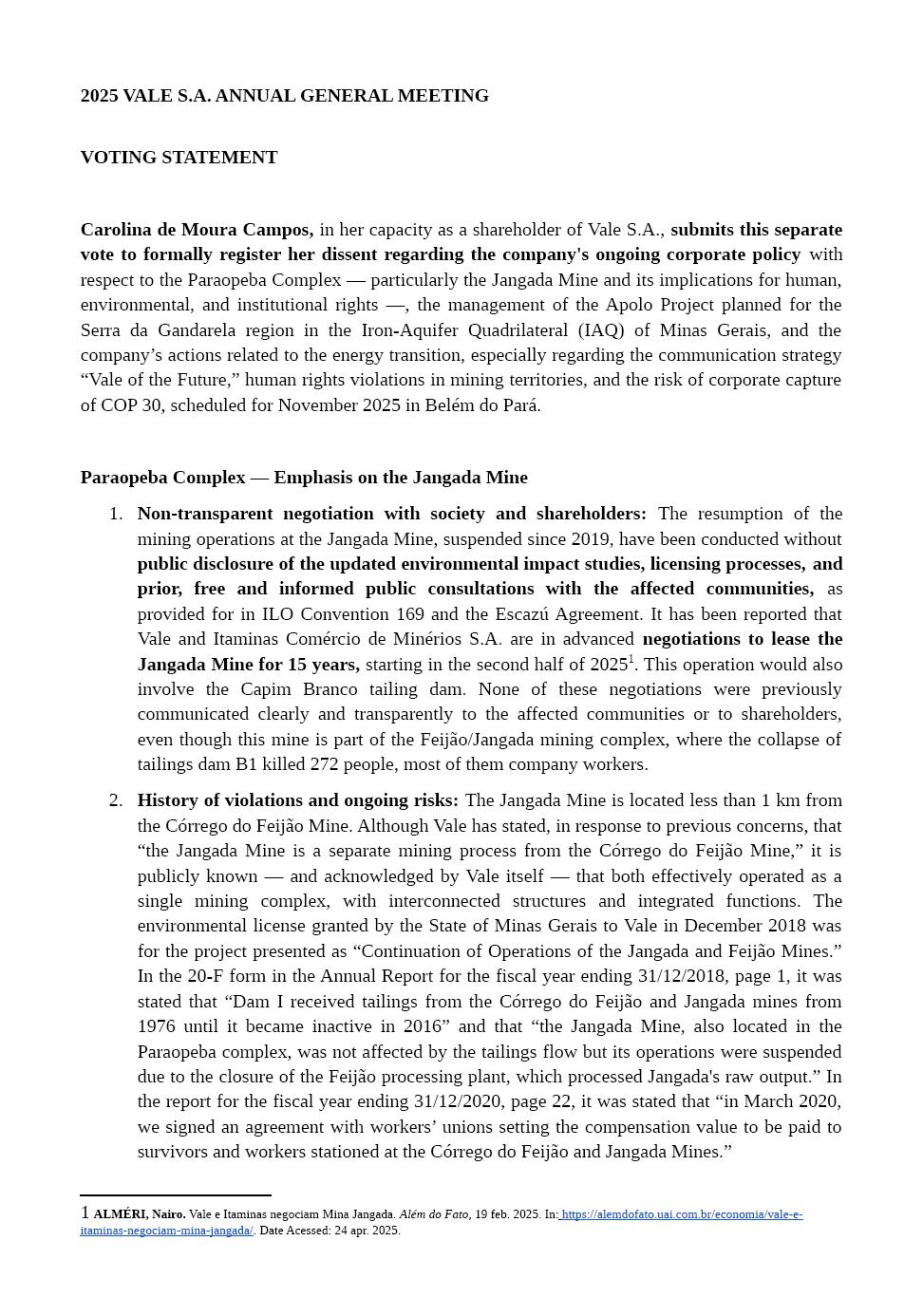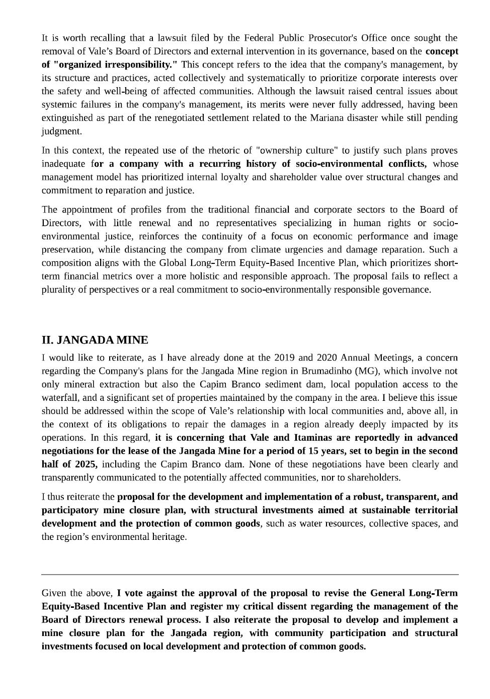 2025 VALE S.A.年度股东大会投票声明Carolina de Moura Campos以淡水河谷公司股东的身份提交这一单独的投票,以正式登记她对公司关于Paraopeba综合体——特别是Jangada矿及其对人类、环境和机构权利的影响——的持续公司政策、为米纳斯吉拉斯州含铁层四边形(IAQ)的Serra da Gandarela地区规划的Apolo项目的管理的异议,以及公司与能源转型相关的行动,特别是关于传播战略“未来的淡水河谷”,采矿地区的侵犯人权行为,以及企业捕获COP30的风险,定于2025年11月在Bel é m do Par á举行。Paraopeba Complex — Jangada矿强调1。与社会和股东进行不透明的谈判:根据国际劳工组织第169号公约和《Escaz ú协议》的规定,自2019年暂停的Jangada矿的采矿作业的恢复是在没有公开披露更新的环境影响研究、许可程序以及事先与受影响社区进行自由和知情的公众协商的情况下进行的。有消息称,淡水河谷和Itaminas Com é rcio de Min é rios S.A.正在就租用Jangada矿进行为期15年的高级谈判,从2051年下半年开始。这项行动还将涉及Capim Branco尾矿坝。此前,这些谈判都没有向受影响的社区或股东进行明确和透明的沟通,尽管这座矿山是Feij ã o/Jangada采矿综合体的一部分,那里的尾矿坝B1坍塌造成272人死亡,其中大多数是公司工人。2.违规历史和持续风险:Jangada矿距离C ó rrego do Feij ã o矿不到1公里。尽管淡水河谷针对此前的担忧表示,“Jangada矿与C ó rrego do Feij ã o矿是一个独立的采矿过程”,但众所周知——淡水河谷自己也承认——两者都有效地作为一个单一的采矿综合体运作,具有相互关联的结构和一体化的功能。米纳斯吉拉斯州于2018年12月授予淡水河谷的环境许可是针对“继续运营Jangada和Feij ã o矿山”的项目。在截至31/12/2018财年年度报告第1页的20-F表格中,称“大坝I从1976年开始接收C ó rrego do Feij ã o和Jangada矿山的尾矿,直到2016年停止活动”,“同样位于Paraopeba综合体的Jangada矿山没有受到尾矿流的影响,但由于处理Jangada原料产量的Feij ã o加工厂关闭,其运营暂停。”在截至2020年12月31日的财政年度报告第22页中,指出“2020年3月,我们与工人工会签署了一项协议,确定了向幸存者和驻扎在C ó rrego do Feij ã o和Jangada矿山的工人支付的补偿价值。”1 ALM é RI,奈罗。Vale e Itaminas negociam Mina Jangada。Al é m do Fato,2025年2月19日。在:https://alemdofato.uai.com.br/economia/vale-eitaminas-negociam-mina-jangada/。访问日期:2025年4月24日。