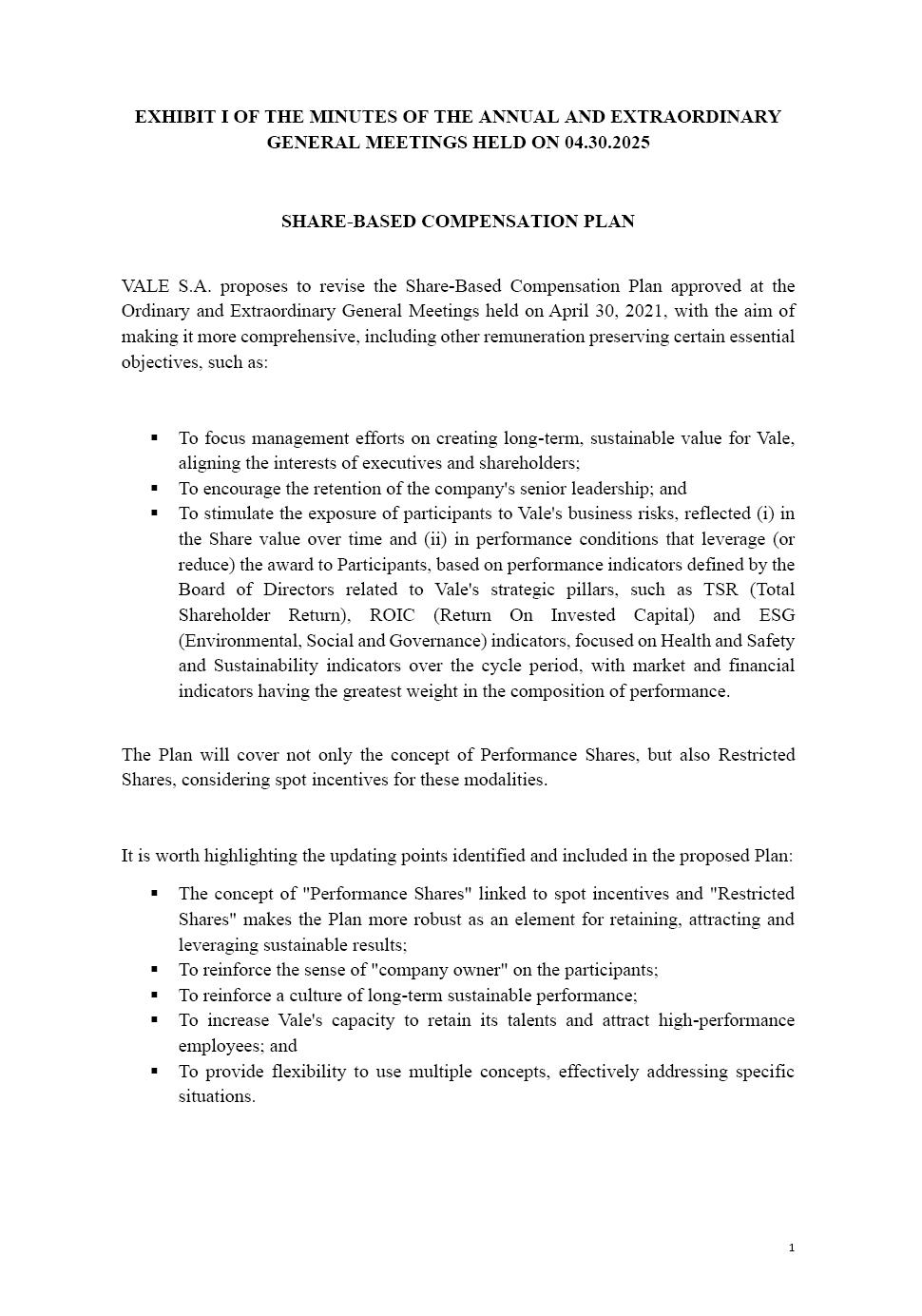 于2025年4月30日举行的年度及特别股东大会会议记录的附件一VALE S.A.建议修订于2021年4月30日举行的普通及特别股东大会上批准的股份补偿计划,以使其更全面,包括保留若干基本目标的其他薪酬,例如:▪将管理层的工作重点放在为淡水河谷创造长期、可持续的价值上,使高管和股东的利益保持一致;▪鼓励保留公司高层领导;以及▪为刺激参与者对淡水河谷业务风险的暴露,反映在(i)随着时间推移的股份价值和(ii)影响(或减少)对参与者的奖励的业绩条件中,基于董事会定义的与淡水河谷战略支柱相关的业绩指标,如TSR(股东总回报)、ROIC(投资资本回报率)和ESG(环境、社会和治理)指标,重点关注周期期间的健康和安全以及可持续性指标,市场和财务指标在业绩构成中的权重最大。该计划将不仅涵盖业绩股概念,还包括限制性股票,考虑对这些模式进行现货激励。值得强调的是,在拟议计划中确定并列入的更新要点:▪与现货激励和“限制性股票”挂钩的“业绩股”概念,使该计划作为保留、吸引和利用可持续成果的要素变得更加稳健;▪在参与者身上强化“公司所有者”意识;▪强化长期可持续绩效文化;▪提高淡水河谷留住人才和吸引高绩效员工的能力;以及▪提供使用多种概念的灵活性,有效应对特定情况。