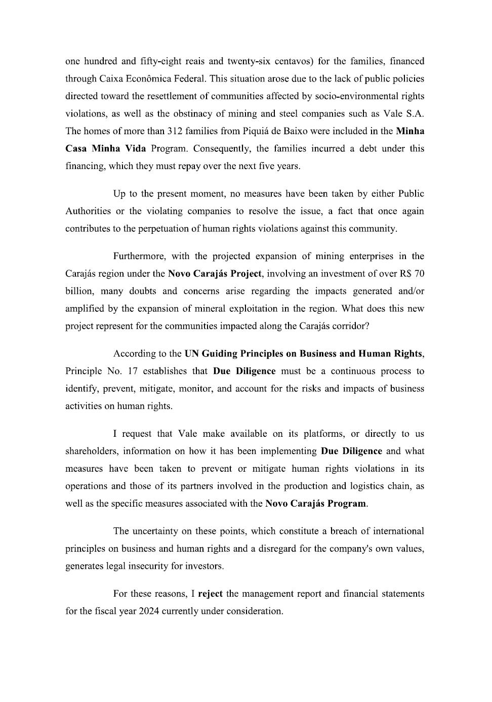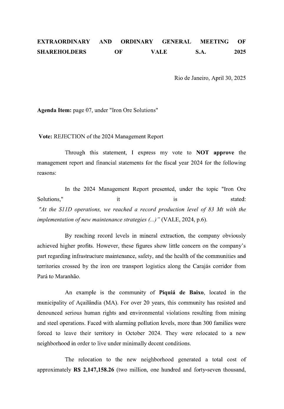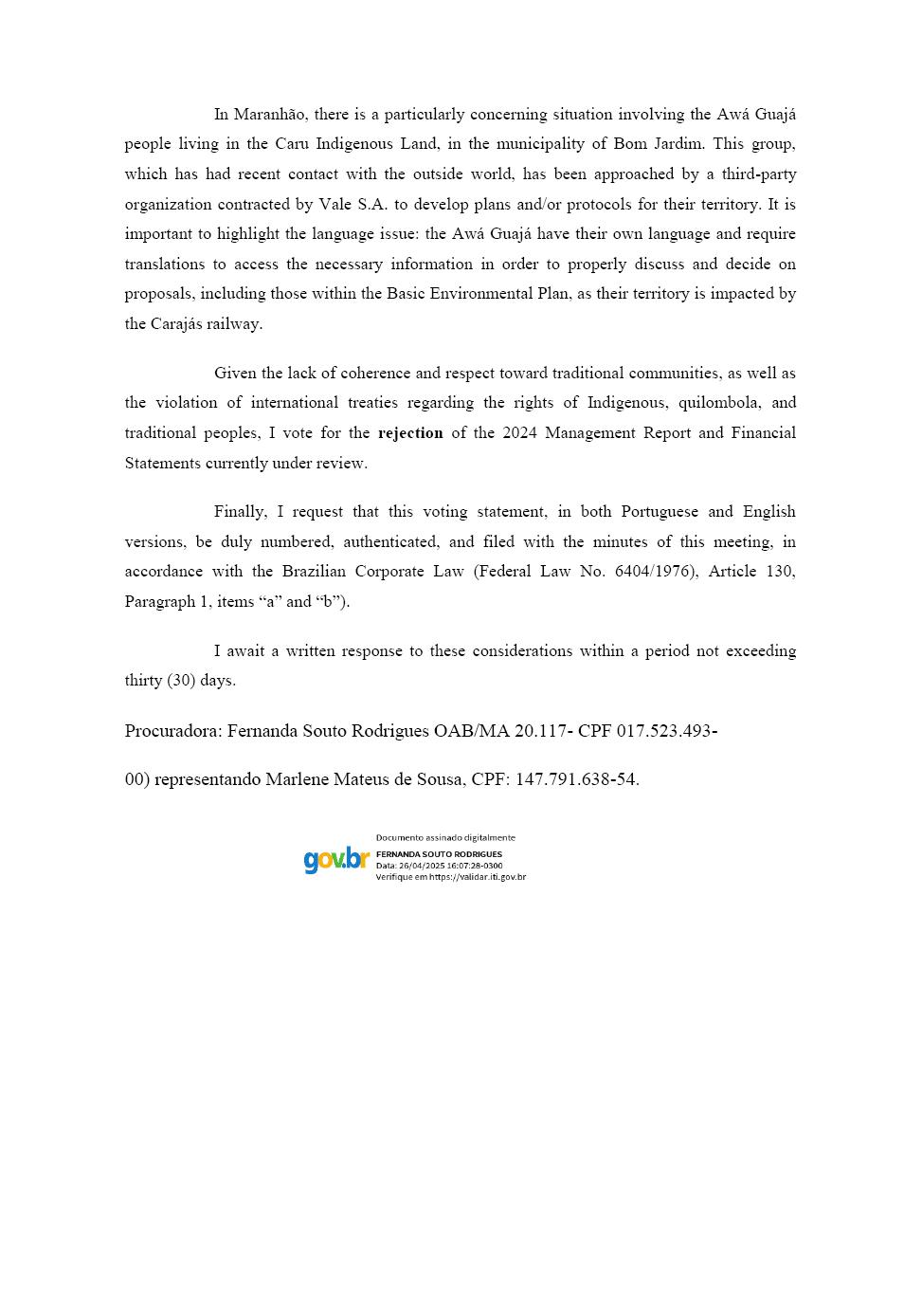 在Maranh ã o,居住在Bom Jardim市Caru土着土地上的Aw á Guaj á人的情况尤其令人担忧。这家最近与外界有过接触的集团,已被淡水河谷公司签约的第三方机构接洽,以制定其领土的计划和/或协议。重要的是要强调语言问题:AW á Guaj á人有自己的语言,需要翻译来获取必要的信息,以便适当讨论和决定提案,包括基本环境计划内的提案,因为他们的领土受到卡拉加斯铁路的影响。鉴于对传统社区缺乏连贯性和尊重,以及违反有关土着、基隆波拉和传统民族权利的国际条约,我投票支持否决目前正在审查的2024年管理报告和财务报表。最后,我要求根据巴西公司法(第6404/1976号联邦法)第130条第1款,项目“a”和“b”,对葡萄牙文和英文本的这份投票声明进行适当编号、认证并与本次会议记录一起归档。我等待在不超过三十(30)天的期限内对这些考虑作出书面答复。Procuradora:Fernanda Souto Rodrigues OAB/MA 20.117-CPF 017.523.493-00)代表Marlene Mateus de Sousa,CPF:147.791.638-54。