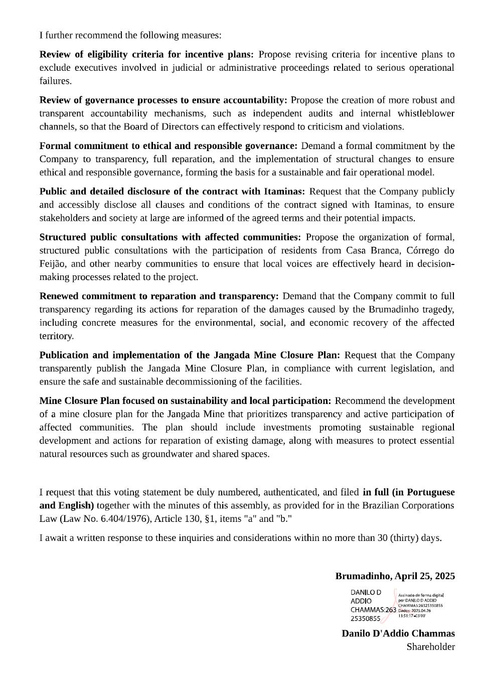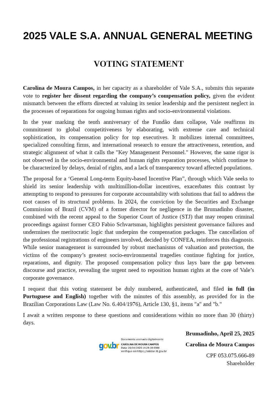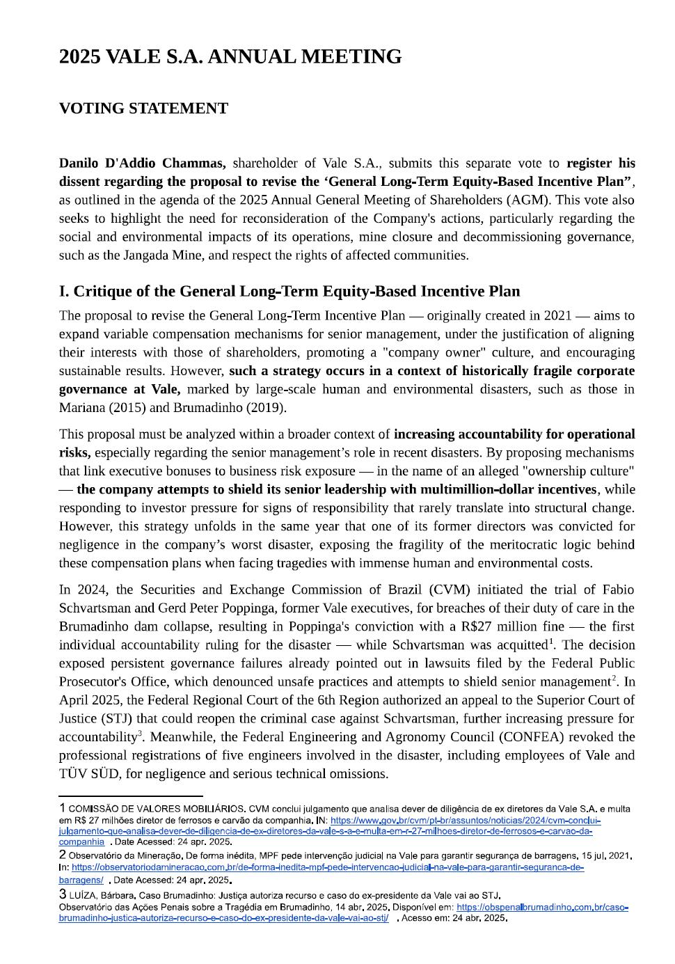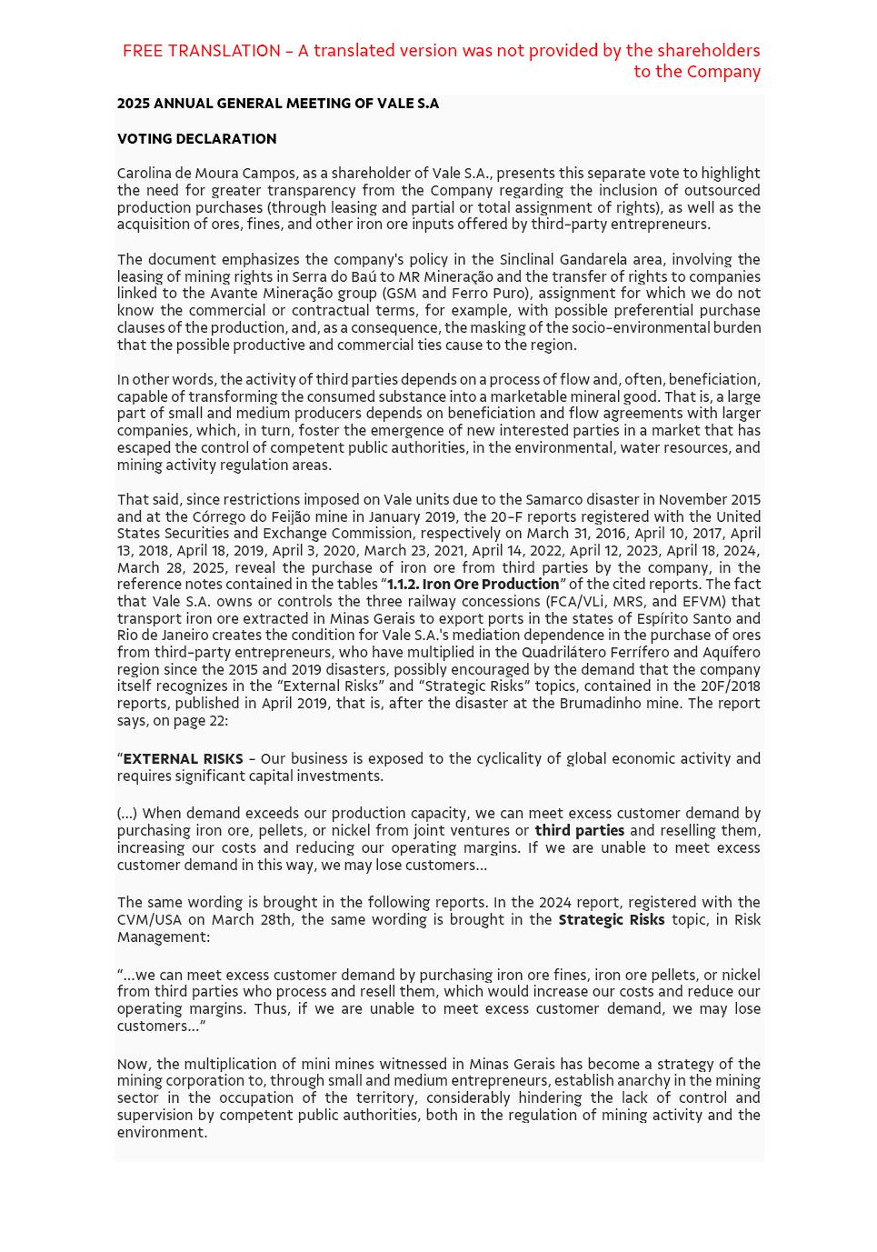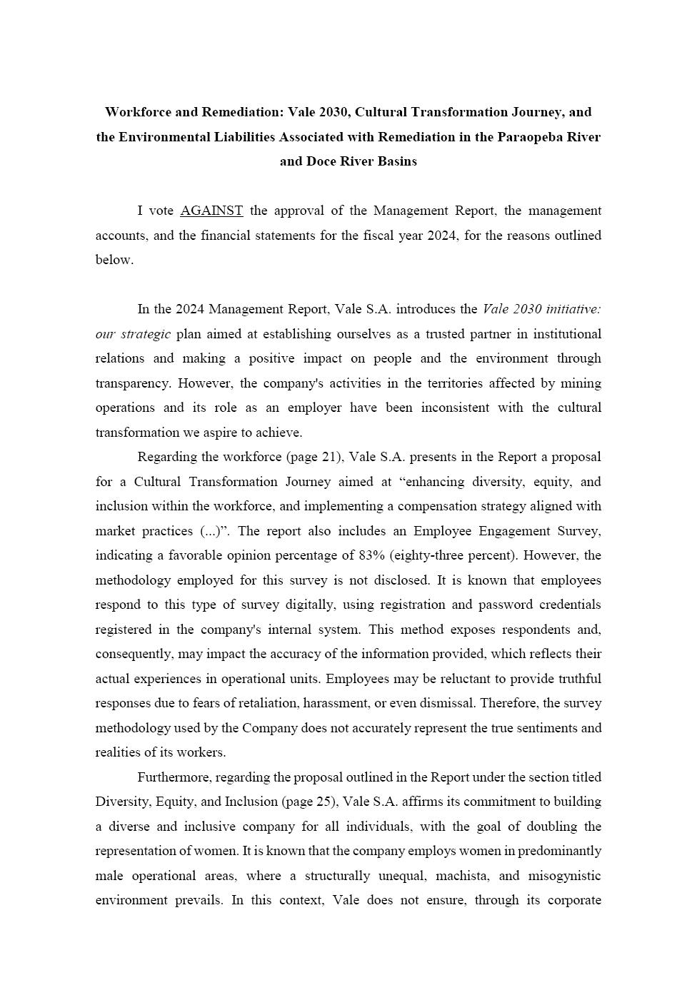 2025年VALE S.A.年度股东大会投票声明Carolina de Moura Campos以淡水河谷公司股东的身份提交这一单独的投票,以登记她对公司薪酬政策的异议,因为旨在评估其高级领导层的努力与对持续侵犯人权和社会环境行为的赔偿过程中的持续忽视之间明显不匹配。在纪念Fund ã o大坝倒塌十周年的这一年里,淡水河谷重申了其对全球竞争力的承诺,以极其谨慎和技术复杂的方式详细阐述了其对高层管理人员的薪酬政策。它动员内部委员会、专业咨询公司和国际研究,以确保所谓的“关键管理人员”的吸引力、保留率和战略一致性。然而,在社会环境和人权赔偿进程中没有看到同样的严谨性,这些进程的特点仍然是拖延、剥夺权利以及对受影响人口缺乏透明度。淡水河谷寻求以数百万美元的激励措施保护其高级领导层的‘一般长期股权激励计划’提案加剧了这种对比,试图通过未能解决其结构性问题的根本原因的解决方案来应对企业问责制的压力。2024年,巴西证券交易委员会(CVM)因在布鲁马迪尼奥灾难中的疏忽而对一名前董事定罪,再加上最近向高等法院(STJ)提出的可能重新启动针对前首席执行官Fabio Schvartsman的刑事诉讼的上诉,这些都凸显了持续的治理失败,并破坏了支撑薪酬方案的精英逻辑。CONFEA决定取消所涉工程师的专业注册,强化了这一诊断。当高级管理层被强大的估值和保护机制包围时,公司最大的社会环境悲剧的受害者继续为正义、赔偿和尊严而战。拟议的补偿政策由此暴露了话语与实践之间的差距,揭示了迫切需要重新定位淡水河谷公司治理核心的人权。我要求按照《巴西公司法》(第6.404/1976号法律)第130条第1款“a”和“b”项的规定,对这份投票声明进行适当编号、认证,并连同大会会议记录全文(葡萄牙文和英文)归档。我等待不超过三十(三十)天内对这些问题和考虑的书面答复。Brumadinho,2025年4月25日Carolina de Moura Campos CPF 053.075.666-89股东情况