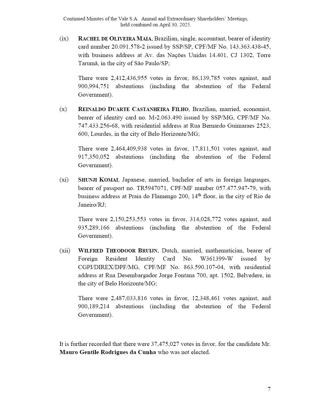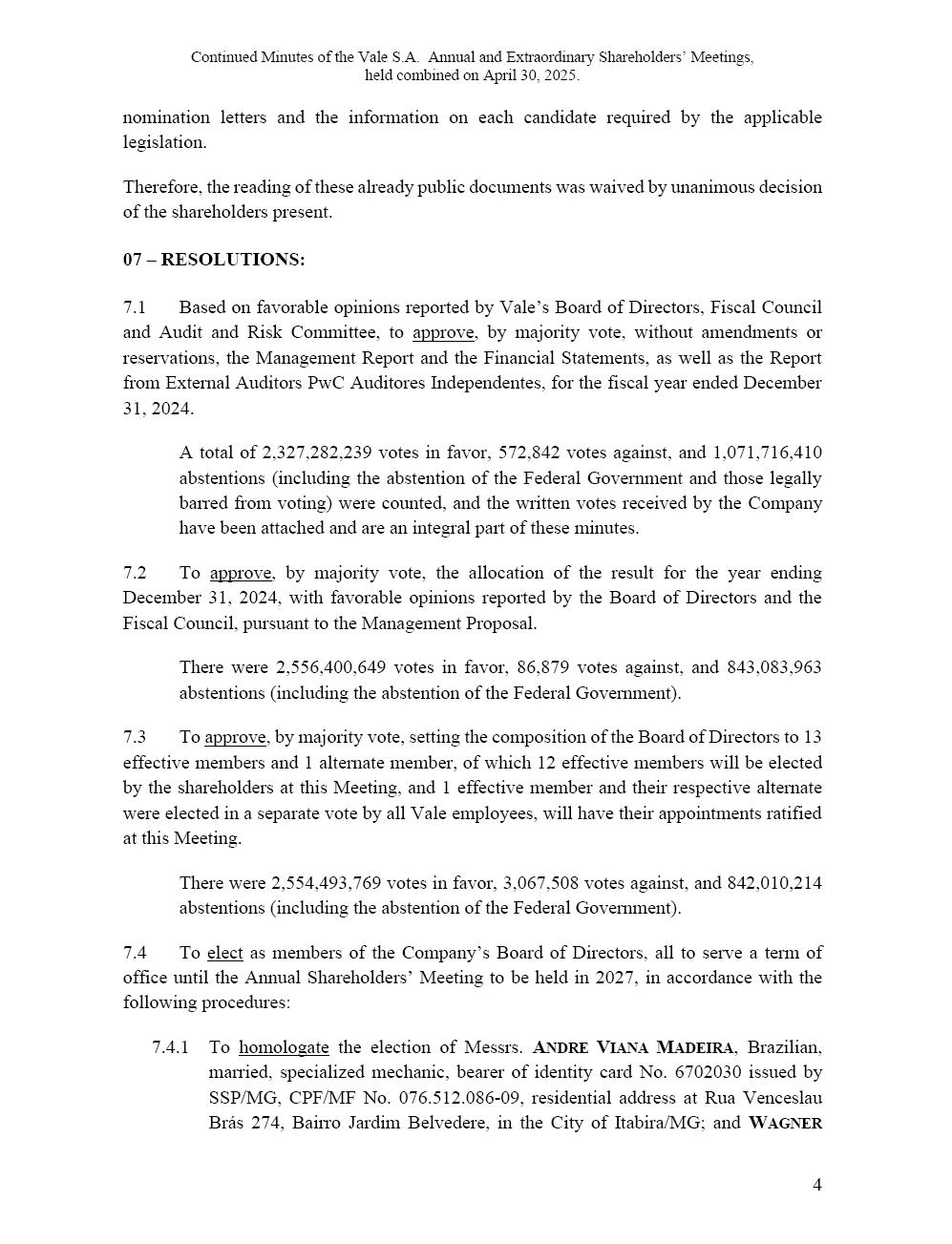 续2025年4月30日合并召开的淡水河谷公司年度股东大会及临时股东大会会议记录。4封提名信以及适用立法要求的关于每位候选人的信息。因此,经与会股东一致决定,放弃阅读这些已经公开的文件。07 –决议:7.1根据淡水河谷董事会、财政委员会和审计与风险委员会报告的有利意见,以多数票、无修正或保留的方式批准截至2024年12月31日的财政年度的管理报告和财务报表,以及外聘审计员普华永道独立审计员的报告。累计2,327,282,239票赞成、572,842票反对、1,071,716,410票弃权(包括联邦政府的弃权票和法律上禁止投票的人)被计算在内,公司收到的书面投票已附后,并为本会议记录的组成部分。7.2根据管理层提案,以多数票通过董事会和财政委员会报告的赞成意见分配截至2024年12月31日止年度的结果。2,556,400,649票赞成,86,879票反对,843,083,963票弃权(其中联邦政府弃权)。7.3以多数票通过将董事会的组成确定为13名有效成员和1名候补成员,其中12名有效成员将由股东在本次会议上选举产生,1名有效成员及其各自的候补成员由淡水河谷全体员工在单独投票中选举产生,其任命将在本次会议上获得批准。赞成票2,554,493,769票,反对票3,067,508票,弃权票842,010,214票(含联邦政府弃权票)。7.4选举为公司董事会成员,任期均至2027年召开的年度股东大会,按照以下程序进行:7.4.1选举Andre VIana MADEIRA先生,巴西人,已婚,专业机械师,持有由SSP/MG签发的第6702030号身分证,TERM0/MG编号为076.512.086-09的MF编号,居住地址为Rua Venceslau Br á s 274,Bairro Jardim Belvedere,在Itabira/MG市;和WAGNER