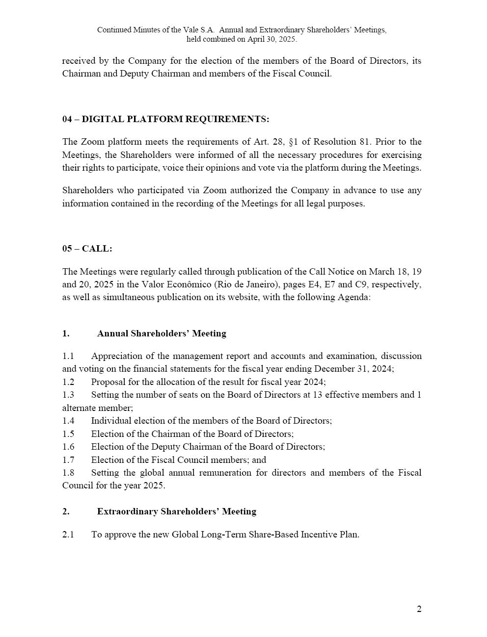 续2025年4月30日合并召开的淡水河谷公司年度股东大会及临时股东大会会议记录。2为公司选举董事会成员、董事长和副董事长及财政委员会成员而收到。04 –数字平台要求:Zoom平台符合第81号决议第28条、§ 1的要求。会议召开前,股东在会议期间通过平台被告知行使其参与、发表意见和投票权利的所有必要程序。通过Zoom参与的股东事先授权公司将会议记录中包含的任何信息用于所有合法目的。05 – CALL:这些会议是通过分别于2025年3月18日、19日和20日在Valor Econ ô mico(Rio de Janeiro)第E4、E7和C9页发布呼吁通知以及在其网站上同时发布的方式定期召开的,议程如下:1。年度股东大会1.1对管理层报告和账目的赞赏以及对截至12月31日的财政年度财务报表的审查、讨论和投票,2024年度;1.2关于2024财政年度结果分配的提案;1.3将董事会席位定为13名有效成员和1名候补委员;1.4董事会成员个人选举;1.5选举董事会主席;1.6选举董事会副主席;1.7选举财政委员会成员;1.8确定2025年董事和财政委员会成员的全球年度薪酬。2.临时股东大会2.1批准新的全球长期股权激励计划。