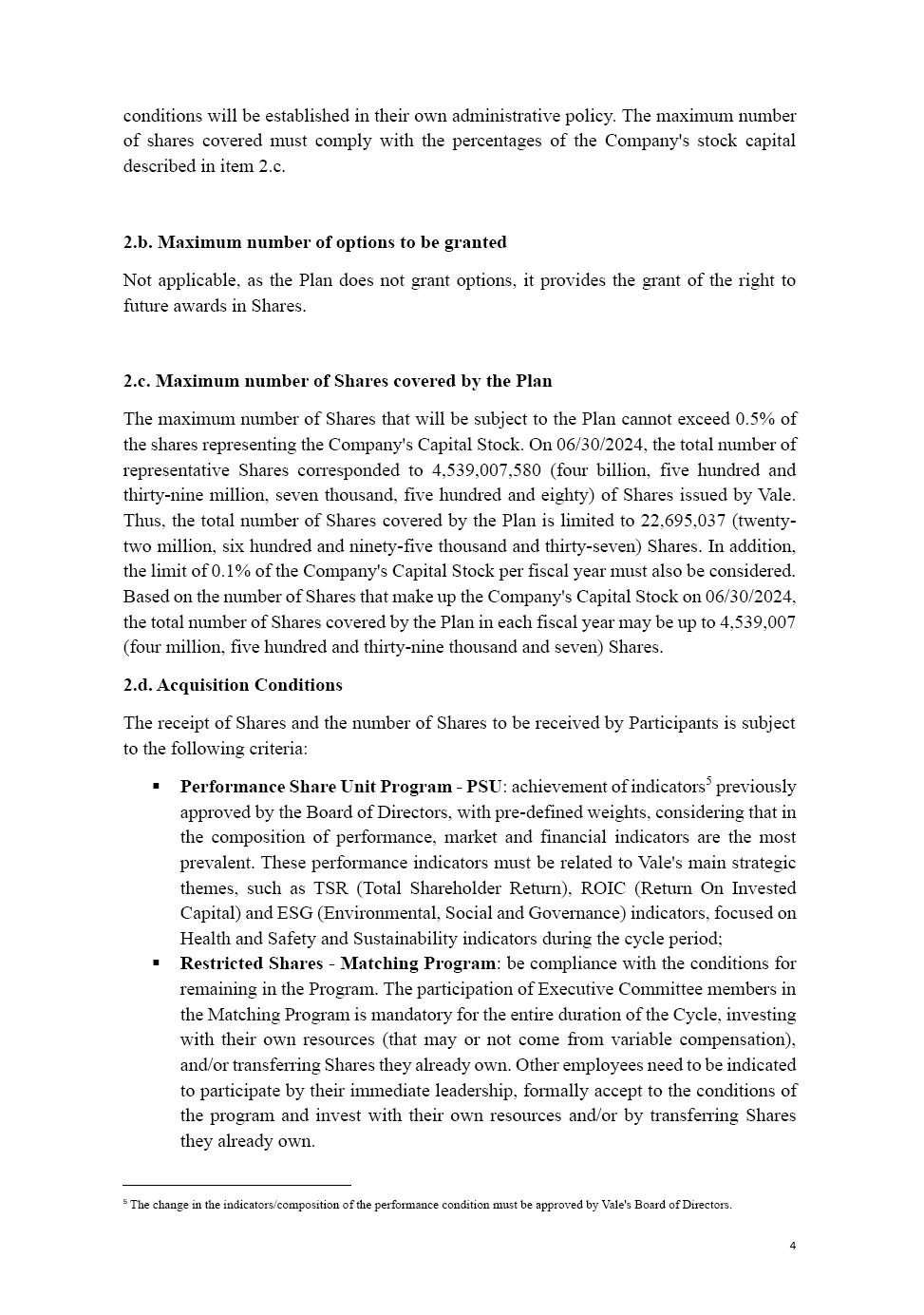 将在自己的行政政策中确立条件。涵盖的最大股份数量必须符合2.c项所述的公司股本百分比。2.b.将授出的最大期权数量不适用,由于该计划不授出期权,它提供了授予未来股份奖励的权利。2.c。计划涵盖的最大股份数量将受该计划约束的最大股份数量不能超过代表公司股本的股份的0.5%。于06/30/2024,代表股份总数对应淡水河谷已发行的4,539,007,580股(四亿五亿三千九百万股、七千五百八十股)股份。因此,该计划涵盖的股份总数限制为22,695,037(两千二百万,六十九万五千三十七)股。此外,还必须考虑每个会计年度公司股本的0.1%的限制。根据于06/30/2024组成公司股本的股份数目,该计划于每个财政年度所涵盖的股份总数最多可达4,539,007股(四百万股,五百三十九万零七股)。2.d.收购条件参与者收到的股份和将收到的股份数量须遵守以下标准:▪绩效份额单位计划-PSU:实现董事会先前批准的指标5,预设权重,考虑到在绩效构成中,市场和财务指标最为普遍。这些绩效指标必须与淡水河谷的主要战略主题相关,例如TSR(股东总回报)、ROIC(投资资本回报率)和ESG(环境、社会和治理)指标,重点关注周期期间的健康和安全以及可持续性指标;▪限制性股票-匹配方案:符合留在方案条件。执行委员会成员参与匹配计划在整个周期期间都是强制性的,使用他们自己的资源(可能来自或不来自可变薪酬)进行投资,和/或转让他们已经拥有的股份。其他员工需要由其直属领导表示参与,正式接受该计划的条件并以自己的资源和/或通过转让他们已经拥有的股份进行投资。5业绩条件的指标/构成的变化必须得到淡水河谷董事会的批准。