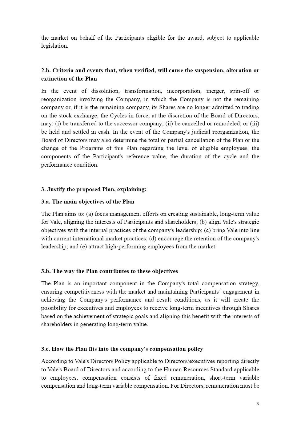 市场代表有资格获得奖励的参与者,但须遵守适用的法律。2.h。经核实后将导致计划在涉及公司的解散、转型、成立为公司、合并、分拆或重组的情况下暂停、变更或终止的标准和事件,其中公司不是剩余公司,或者如果是剩余公司,其股份不再获准在证券交易所交易,则董事会可酌情决定有效的周期:(i)转让给继任公司;(ii)被注销或改造;或(iii)以现金持有和结算。在公司发生司法重整的情况下,董事会还可以就符合条件的员工水平、参与者参考价值的组成部分、周期的持续时间和绩效条件确定计划的全部或部分取消或本计划的计划的变更。3.说明拟议计划的合理性,说明:3.a。该计划的主要目标该计划旨在:(a)将管理工作的重点放在为淡水河谷创造可持续的长期价值上,使参与者和股东的利益保持一致;(b)使淡水河谷的战略目标与公司领导层的内部做法保持一致;(c)使淡水河谷与当前的国际市场做法保持一致;(d)鼓励保留公司的领导地位;以及(e)从市场上吸引高绩效员工。3.b。该计划为实现这些目标做出贡献的方式该计划是公司总薪酬战略的重要组成部分,可确保与市场的竞争力,并保持参与者参与实现公司业绩和结果条件,因为它将为高管和员工创造可能性,在实现战略目标的基础上通过股份获得长期激励,并使这一利益与股东的利益保持一致,以产生长期价值。3.c。该计划如何融入公司薪酬政策根据适用于直接向淡水河谷董事会汇报的董事/高管的淡水河谷董事政策和适用于员工的人力资源标准,薪酬包括固定薪酬、短期可变薪酬和长期可变薪酬。对董事而言,薪酬必须