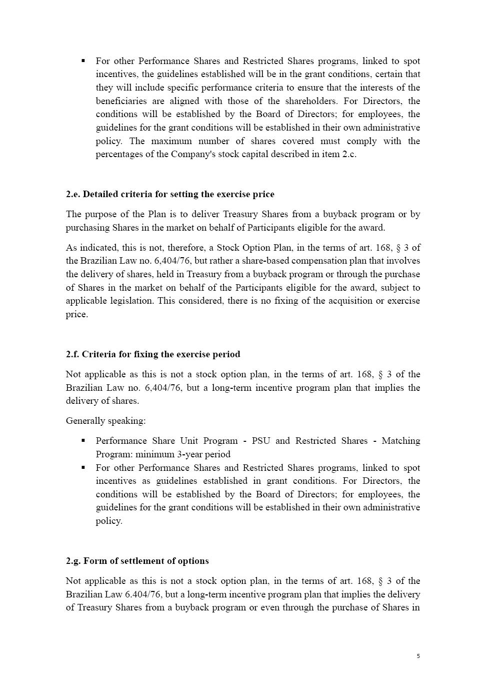 对于其他业绩股和限制性股票计划,与现货激励挂钩,制定的指引将在授予条件中,确定它们将包括具体的业绩标准,以确保受益人的利益与股东的利益保持一致。对于董事,条件将由董事会制定;对于员工,授予条件的指引将在自己的行政政策中制定。涵盖的最大股份数量必须符合2.c项所述的公司股本百分比。2.e.确定行权价的详细标准该计划的目的是通过回购计划交付库存股或代表有资格获得奖励的参与者在市场上购买股票。正如所指出的,因此,按照巴西第6,404/76号法律第168条第3款的规定,这不是一项股票期权计划,而是一项基于股份的补偿计划,该计划涉及通过回购计划或通过代表有资格获得奖励的参与者在市场上购买股份的方式在库房中持有的股份的交付,但须遵守适用的立法。经此考虑,不存在固定收购或行权价格的情况。2.f.确定行权期的标准不适用,因为根据巴西第6,404/76号法律第168条第3款的规定,这不是一项股票期权计划,而是一项意味着交付股份的长期激励计划计划。一般来说:▪业绩股单位方案-PSU和限制性股票-匹配方案:最短3年期限▪对于其他业绩股和限制性股票计划,挂钩现货激励作为授予条件中确立的准则。对于董事,条件将由董事会制定;对于员工,授予条件的指引将在自己的行政政策中制定。2.g.期权的结算形式不适用,因为根据巴西法律第6.404/76条第168条第3款,这不是一种股票期权计划,而是一种长期激励计划计划,这意味着从回购计划中交付库存股,甚至是通过购买