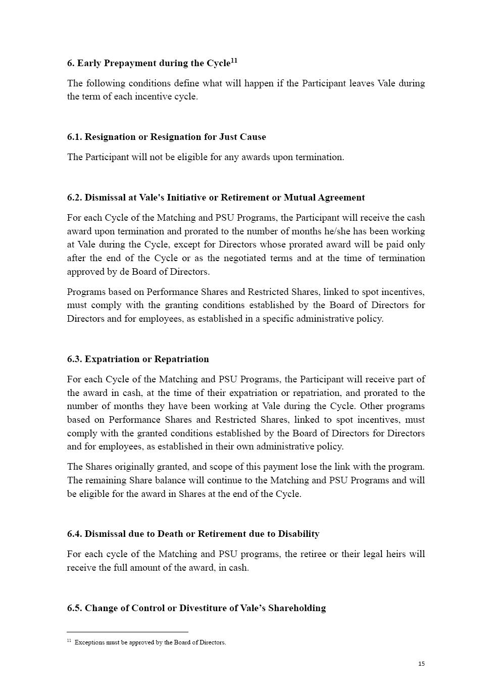 6.周期内提前提前还款11以下条件定义了如果参与者在每个激励周期的期限内离开淡水河谷将会发生什么情况。6.1.因正当理由辞职或辞职参与者在终止时将没有资格获得任何奖励。6.2.在淡水河谷的倡议或退休或相互协议下解雇每个周期的匹配和PSU计划,参与者将在终止时获得现金奖励,并按周期内他/她在淡水河谷工作的月数按比例分配,但董事除外,其按比例分配的奖励将仅在周期结束后或作为协商条款支付,并在终止时经董事会批准。基于绩效份额和限制性股票的计划,与现货激励挂钩,必须符合董事会为董事和员工制定的授予条件,具体的行政政策规定。6.3.对于匹配和PSU计划的每个周期的外派或遣返,参与者将在其外派或遣返时获得部分现金奖励,并按周期内他们在淡水河谷工作的月数按比例分配。其他基于业绩股和限制性股票的方案,与现货激励挂钩,必须遵守董事会为董事和员工制定的授予条件,这是在他们自己的行政政策中规定的。最初授予的股份,此次支付的范围与该计划失去联系。剩余的股份余额将继续用于匹配和PSU计划,并将有资格在周期结束时获得股份奖励。6.4.因身故辞退或因残疾退休的每个周期的匹配和PSU计划,退休人员或其法定继承人将获得全额奖励,以现金形式。6.5.淡水河谷股权控制权变更或剥离11个例外须经董事会批准。