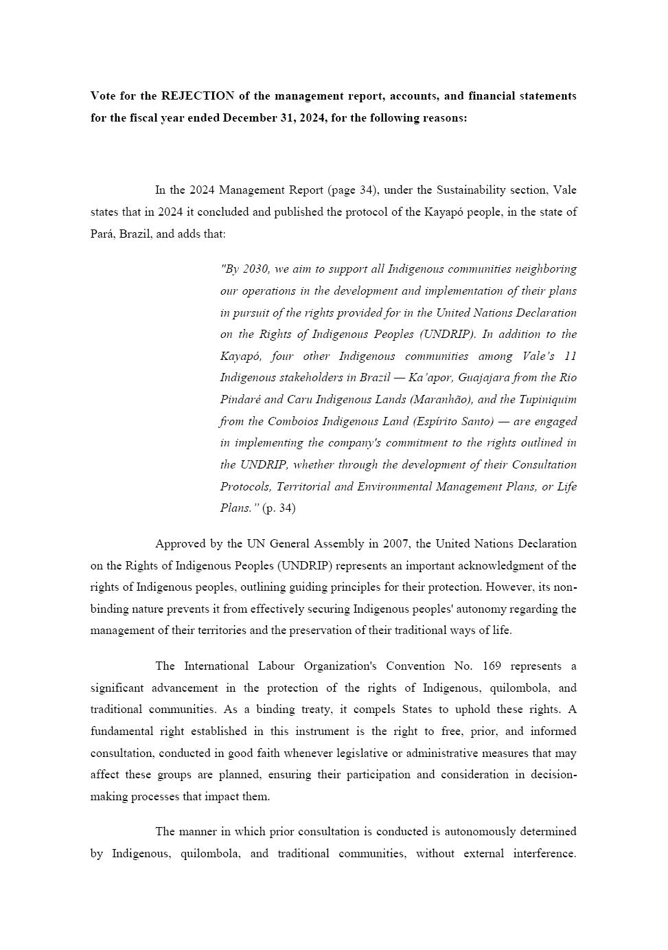 投票支持否决截至2024年12月31日的财政年度的管理报告、账目和财务报表,理由如下:在2024年管理报告(第34页)中,在可持续发展部分下,淡水河谷表示,它于2024年在巴西帕拉州缔结并公布了Kayap ó人的议定书,并补充说:"到2030年,我们的目标是支持与我们业务相邻的所有土著社区制定和实施他们的计划,以追求《联合国土著人民权利宣言》(UNDRIP)规定的权利。除了Kayap ó,淡水河谷在巴西的11个土着利益相关者中的其他四个土着社区—— Ka'apor、来自Rio Pindar é和Caru土着土地(Maranh ã o)的Guajajara,以及来自Comboios土着土地(Esp í rito Santo)的Tupiniquim ——正在通过制定协商协议、领土和环境管理计划或生活计划,参与落实该公司对UNDRIP中概述的权利的承诺。”(第34页)联合国大会2007年批准的《联合国土著人民权利宣言》(UNDRIP)是对土著人民权利的重要承认,概述了保护土著人民的指导原则。然而,其不具约束力的性质使其无法有效确保土著人民在管理其领土和维护其传统生活方式方面的自主权。国际劳工组织第169号公约代表着在保护土着、基隆波拉和传统社区权利方面的重大进步。作为一项具有约束力的条约,它迫使各国维护这些权利。这项文书确立的一项基本权利是自由、事先和知情协商的权利,每当计划采取可能影响这些群体的立法或行政措施时,就本着诚意进行协商,确保他们参与和考虑影响他们的决策过程。事先协商的方式由土著、quilombola和传统社区自主决定,不受外部干预。