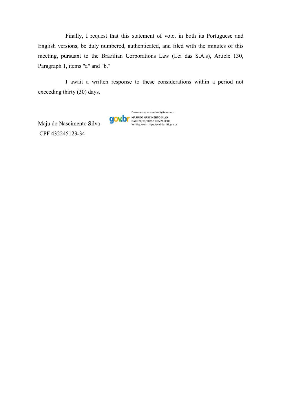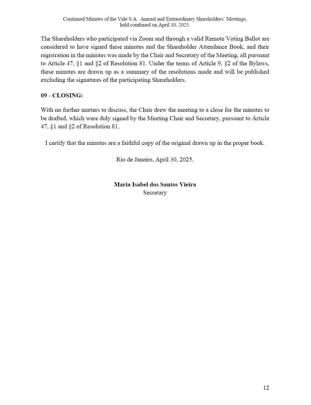 12通过Zoom和通过有效远程投票参与的股东被视为已在这些会议记录和股东出席簿上签名,他们在会议记录中的登记由会议主席和秘书进行,所有这些都是根据第81号决议第47条、§ 1和§ 2进行的。根据《附例》第9条第2款的规定,本会议记录是作为所作决议的摘要起草的,并将予以公布,但不包括与会股东的签名。09-闭幕:由于没有进一步讨论的事项,主席根据第81号决议第47条、第1节和第2节,提请会议闭幕,以便起草会议记录,并由会议主席和秘书正式签署。我证明,会议记录是在适当的书中起草的原件的忠实副本。2025年4月30日,里约热内卢。玛丽亚·伊莎贝尔·多斯桑托斯·维埃拉秘书