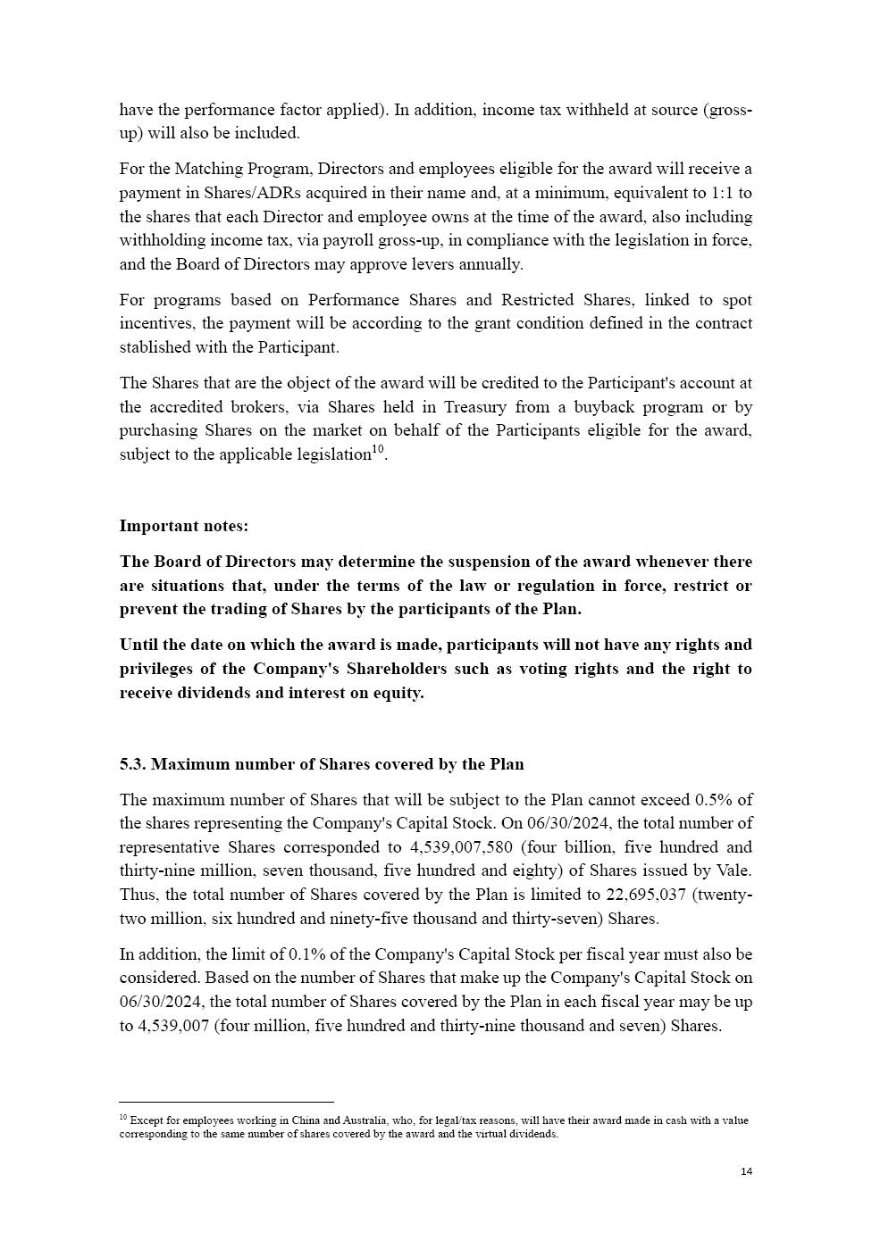 应用了性能因素)。此外,源头代扣所得税(毛额)也将包括在内。对于匹配计划,有资格获得奖励的董事和员工将获得以其名义获得的股份/ADR的付款,至少相当于每位董事和员工在奖励时拥有的股份的1:1,还包括预扣所得税,根据现行立法,通过工资总额,董事会可以每年批准杠杆。对于以业绩股和限制性股票为基础、与现货激励挂钩的方案,将根据与参与者建立的合同中定义的授予条件进行支付。作为奖励对象的股票将通过回购计划中的库存股票或代表有资格获得奖励的参与者在市场上购买股票的方式记入参与者在认可经纪商的账户,但须遵守适用的法律10。重要提示:每当存在根据现行法律或法规的条款限制或阻止计划参与者交易股份的情况时,董事会可决定暂停授予。在授予之日之前,参与者将不享有公司股东的任何权利和特权,例如投票权和获得股息和股权利息的权利。5.3.计划涵盖的最大股份数目将受计划规限的最大股份数目不能超过代表公司股本的股份的0.5%。于06/30/2024,代表股份总数对应淡水河谷已发行的4,539,007,580股(四亿五亿三千九百万股、七千五百八十股)股份。因此,该计划涵盖的股份总数限制为22,695,037(两千二百万,六十九万五千三十七)股。此外,还必须考虑每个会计年度公司股本的0.1%的限制。根据于06/30/2024组成公司股本的股份数目,该计划在每个财政年度所涵盖的股份总数最多可达4,539,007股(四百万股,五百三十九万零七股)。10除在中国和澳大利亚工作的员工外,出于法律/税务原因,他们将获得现金奖励,其价值对应于奖励所涵盖的相同数量的股票和虚拟股息。