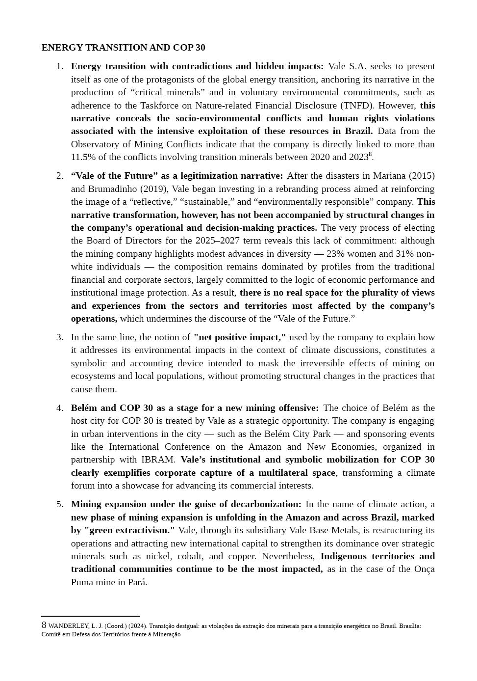 能源转型和COP30 1。矛盾重重、影响隐蔽的能源转型:淡水河谷公司寻求将自己展示为全球能源转型的主角之一,将其叙述锚定在“关键矿物”的生产和自愿的环境承诺中,例如遵守自然相关财务披露工作组(TNFD)。然而,这种说法掩盖了与巴西密集开采这些资源有关的社会环境冲突和侵犯人权行为。矿业冲突观察站的数据显示,该公司与2020年至20238年期间超过11.5%的涉及过渡矿产的冲突直接相关。2.“未来淡水河谷”作为合法化叙事:在马里亚纳(2015年)和布鲁马迪尼奥(2019年)发生灾难后,淡水河谷开始投资重塑品牌进程,旨在强化“反思型”、“可持续”和“对环境负责”的公司形象。然而,这种叙述性转变并没有伴随着公司运营和决策实践的结构性变化。选举2025-2027年任期董事会的过程本身就揭示了这种缺乏承诺的情况:尽管这家矿业公司强调了多样性方面的适度进步—— 23%的女性和31%的非白人个人——但构成仍然以传统金融和企业部门的概况为主,主要致力于经济表现和机构形象保护的逻辑。因此,来自受公司运营影响最大的行业和领域的多元观点和经验并没有真正的空间,这破坏了“未来的淡水河谷”的话语。3.同样,该公司用来解释如何在气候讨论的背景下处理其环境影响的“净积极影响”这一概念构成了一种象征性和会计手段,旨在掩盖采矿对生态系统和当地人口的不可逆转影响,而不会促进导致这些影响的做法的结构性变化。4.Bel é m和COP30作为新矿业攻势的舞台:选择Bel é m作为COP30主办城市被淡水河谷视为战略机遇。该公司正在参与该市的城市干预——例如贝伦城市公园——并赞助与IBRAM合作举办的亚马逊和新经济体国际会议等活动。淡水河谷为COP30进行的制度性和象征性动员,清楚地体现了企业对多边空间的占领,将气候论坛转变为推进其商业利益的展示。5.打着脱碳幌子的矿业扩张:在气候行动的名义下,以“绿色采掘主义”为标志的新一阶段的矿业扩张正在亚马逊地区和巴西各地展开。淡水河谷正在通过其子公司淡水河谷基本金属进行业务重组,并吸引新的国际资本,以加强其对镍、钴和铜等战略矿产的主导地位。尽管如此,土着领土和传统社区继续受到最大的影响,例如Par á的On ç a Puma矿。8 WANDERLEY,L.J.(Coord.)(2024)。Transi çã o desigual:as viola çõ es da exra çã o dos minerais para a transi çã o energ é tica no Brasil。Bras í lia:Commit ê em Defesa dos Territor ó rios frente à Minera çã o