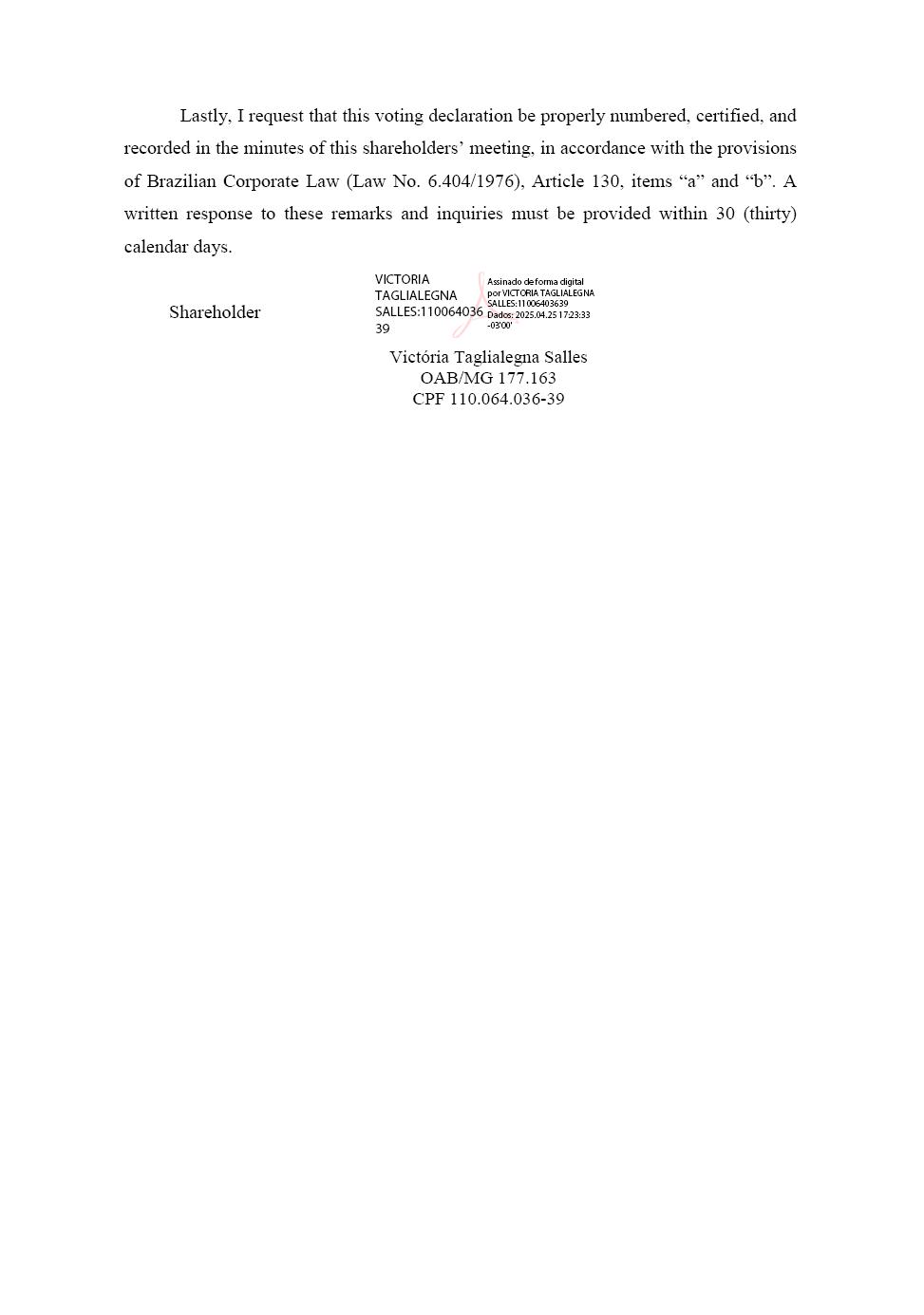 最后,我请求按照巴西公司法(第6.404/1976号法律)第130条“a”和“b”项的规定,对这一投票声明进行适当编号、认证并记录在本次股东大会的会议记录中。必须在30(30)个日历日内提供对这些评论和询问的书面回复。股东Vict ó ria Taglialegna Salles OAB/MG 177.16 3 CPF 110.064.036-39