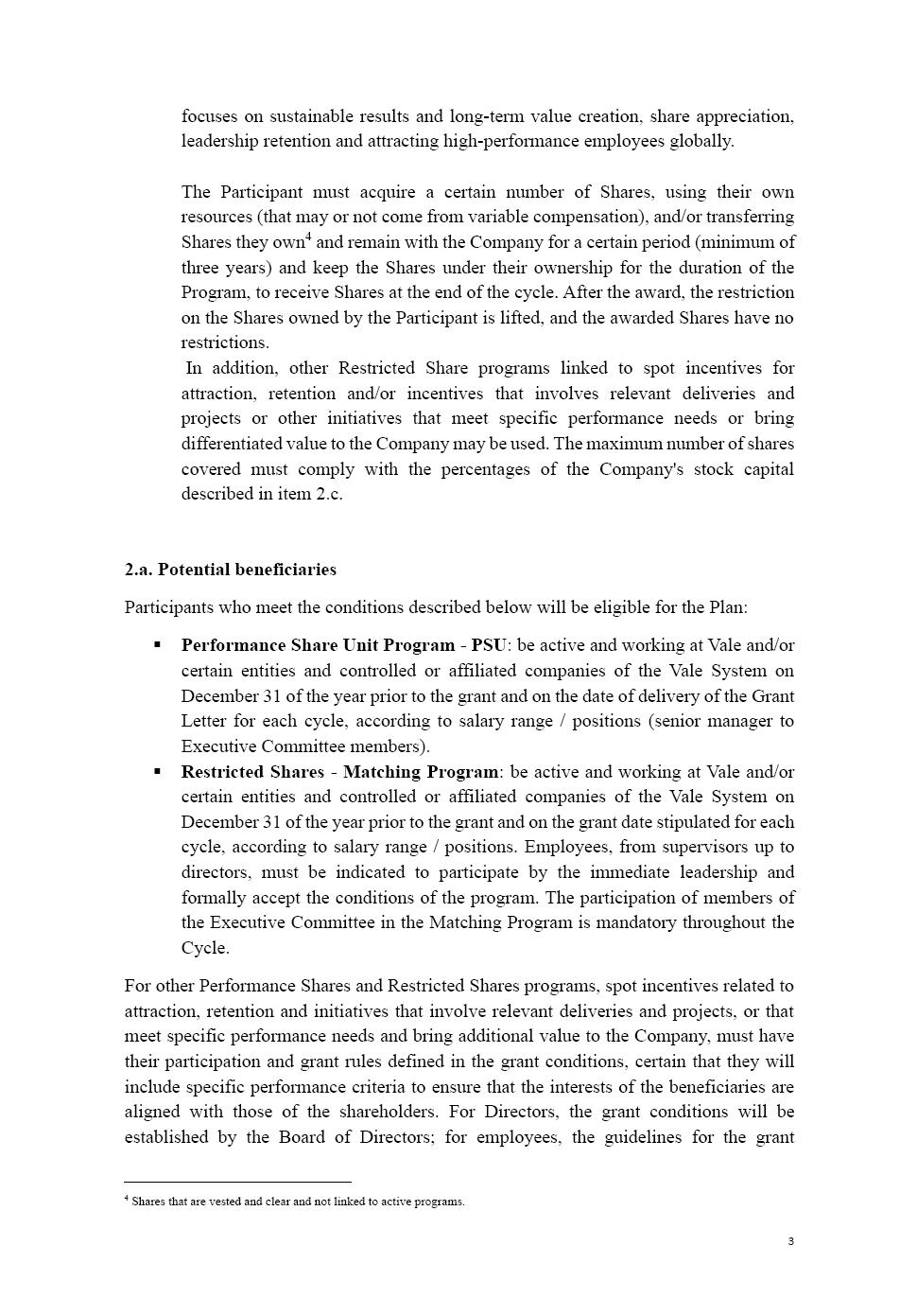 专注于可持续的结果和长期的价值创造、分享欣赏、保持领导地位和在全球范围内吸引高绩效员工。参与者必须获得一定数量的股份,使用他们自己的资源(可能来自或不来自可变补偿),和/或转让他们拥有的股份4并在公司保留一定期限(至少三年)并在计划存续期内保持股份在他们的所有权下,才能在周期结束时获得股份。授予后,参与者拥有的股份解除限制,授予的股份没有任何限制。此外,可能会使用其他与吸引、保留和/或激励的现货激励相关的限制性股票计划,这些计划涉及相关交付和项目或满足特定绩效需求或为公司带来差异化价值的其他举措。涵盖的最大股份数量必须符合2.c项所述的公司股本百分比。2.a.符合下述条件的潜在受益人参与者将有资格参加该计划:▪绩效份额单位计划-PSU:根据薪酬范围/职位(高级管理人员到执行委员会成员),在授予前一年的12月31日和每个周期的授予函交付之日,在淡水河谷和/或淡水河谷系统的某些实体和受控或关联公司积极工作。▪限制性股票-匹配计划:根据工资范围/职位,在授予前一年的12月31日和每个周期规定的授予日期,在淡水河谷和/或淡水河谷系统的某些实体和受控或关联公司中活跃和工作。员工,从主管到董事,必须由直属领导表示参加,并正式接受该方案的条件。执行委员会成员参与匹配计划在整个周期都是强制性的。对于其他业绩股和限制性股票计划,涉及相关交付和项目,或满足特定业绩需求并为公司带来额外价值的与吸引、保留和举措相关的现货激励,必须在授予条件中定义其参与和授予规则,确保它们将包括特定的业绩标准,以确保受益人的利益与股东的利益保持一致。对于董事而言,授予条件将由董事会制定;对于员工而言,授予指引4股既得且明确且不与活动计划挂钩的股份。