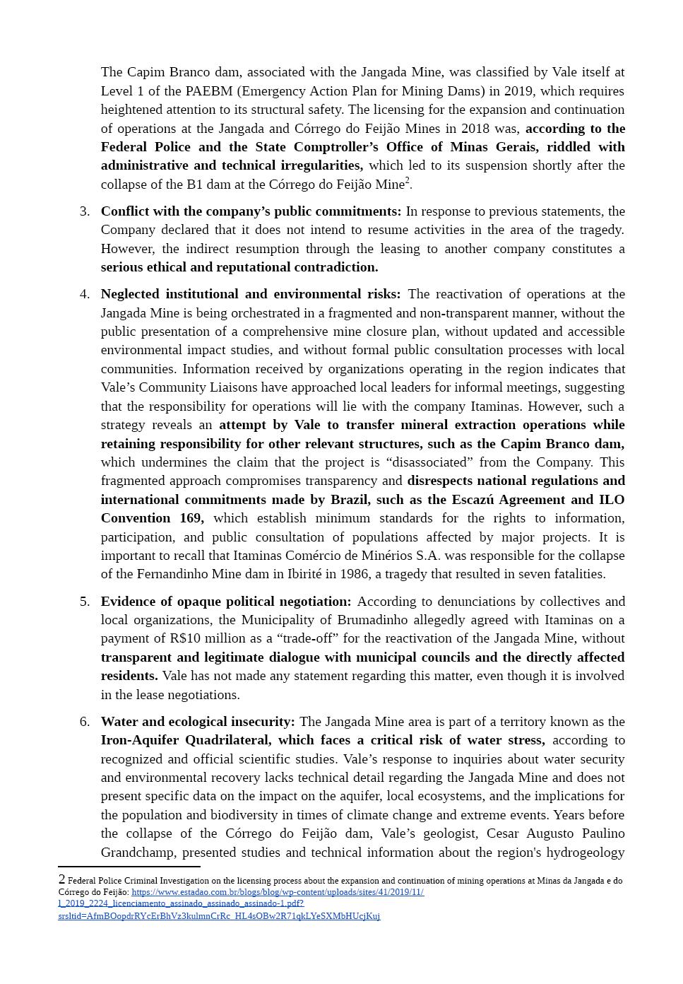 与Jangada矿相关的Capim Branco大坝在2019年被淡水河谷自己归类为PAEBM(采矿大坝紧急行动计划)的1级,这需要高度关注其结构安全性。根据联邦警察和米纳斯吉拉斯州审计长办公室的说法,2018年Jangada和C ó rrego do Feij ã o矿山扩大和继续运营的许可充满了行政和技术违规行为,导致在C ó rrego do Feij ã o矿山2的B1大坝倒塌后不久暂停运营。3.与公司公开承诺冲突:针对此前的声明,公司声明不打算恢复悲剧地区的活动。然而,通过租赁给另一家公司的方式间接复工,构成了严重的道德和声誉矛盾。4.被忽视的体制和环境风险:Jangada矿的重新启动作业正在以零散和不透明的方式精心策划,没有公开提出全面的矿山关闭计划,没有更新和可获得的环境影响研究,也没有与当地社区进行正式的公众协商进程。在该地区运营的组织收到的信息表明,淡水河谷的社区联络员已与当地领导人进行非正式会议,暗示运营责任将由公司Itaminas承担。然而,这样的战略揭示了淡水河谷试图转移矿产开采业务,同时保留对其他相关结构的责任,例如Capim Branco大坝,这破坏了该项目与公司“无关”的说法。这种支离破碎的做法损害了透明度,不尊重巴西作出的国家法规和国际承诺,例如《Escaz ú协定》和《国际劳工组织第169号公约》,它们为受重大项目影响的人群的知情权、参与权和公众咨询权确立了最低标准。重要的是要回顾,伊塔米纳斯Com é rcio de Min é rios S.A.对1986年Ibirit é的Fernandinho矿坝坍塌事故负有责任,这一悲剧导致7人死亡。5.政治谈判不透明的证据:根据集体和当地组织的谴责,Brumadinho市据称与Itaminas同意支付1000万雷亚尔作为重新启动Jangada矿的“权衡”,而没有与市议会和直接受影响的居民进行透明和合法的对话。淡水河谷没有就此事发表任何声明,尽管它参与了租约谈判。6.水和生态不安全:根据公认的官方科学研究,Jangada矿区是被称为铁-含水层四边形的领土的一部分,该地区面临严重的水资源紧张风险。淡水河谷对有关水安全和环境恢复的询问的答复缺乏关于Jangada矿的技术细节,也没有提供关于在气候变化和极端事件发生时对含水层、当地生态系统的影响以及对人口和生物多样性的影响的具体数据。在C ó rrego do Feij ã o大坝坍塌的几年前,淡水河谷的地质学家Cesar Augusto Paulino Grandchamp就有关Minas da Jangada e do C ó rrego do Feij ã o采矿作业扩大和继续的许可程序提交了有关该地区水文地质2联邦警察刑事调查的研究和技术信息:https://www.estadao.com.br/blogs/blog/wp-content/uploads/sites/41/2019/11/l_2019_2224_licenciamento_assinado_assinado_assinado_assinado-1.pdf?srsltid = afmBOOpdrRYcERBHVz3kulmnCrRc _ HL4sOBW2R71qkLYESXMbHUCJKuj
