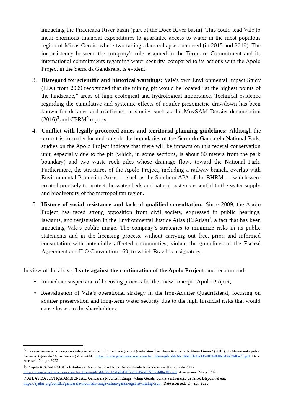 影响Piracicaba河流域(Doce河流域的一部分)。这可能导致淡水河谷产生巨额财政支出,以保证人口最多的米纳斯吉拉斯州地区的供水,那里(2015年和2019年)发生了两起尾矿坝坍塌事故。与其在Serra da Gandarela的Apolo项目的行动相比,该公司在承诺条款中承担的角色与其有关水安全的国际承诺之间的不一致是显而易见的。3.无视科学和历史警告:淡水河谷自己从2009年开始的环境影响研究(环评)承认,采矿坑将位于“景观的最高点”,即具有高度生态和水文重要性的区域。关于含水层压强下降的累积和系统影响的技术证据已为人所知数十年,并在MovSAM Dossier-denunciation(2016)5和CPRM6报告等研究中得到重申。4.与合法保护区和领土规划准则的冲突:尽管该项目正式位于Serra do Gandarela国家公园边界之外,但对Apolo项目的研究表明,这一联邦保护单位将受到影响,特别是由于坑(在某些路段,距离公园边界约80米)和两个排水流向国家公园的废石堆。此外,阿波罗项目的结构,包括一条铁路支线,与环境保护区——例如BHRM的南部APA ——重叠,这些区域的创建正是为了保护对大都市地区的供水和生物多样性至关重要的流域和自然系统。5.历史的社会阻力和缺乏合格的咨询:自2009年以来,Apolo项目面临民间社会的强烈反对,在公开听证会、诉讼和环境正义图集(EJAtlas)7的注册中表达,这一事实一直在影响淡水河谷的公众形象。该公司在公开声明和许可过程中尽量减少风险的战略,没有与可能受影响的社区进行自由、事先和知情的协商,这违反了《Escaz ú协定》和《国际劳工组织第169号公约》的指导方针,巴西是该公约的签署国。有鉴于此,本人投票反对继续推进Apolo项目,并建议:•立即暂停“新概念”Apolo项目的许可程序;•重新评估淡水河谷在铁-含水层四边形的运营战略,重点关注含水层保护和长期水安全,因为财务风险高,会给股东造成损失。5 Dossi ê-den ú ncia:amea ç as e viola çõ es ao direito humano à á gua no Quadril á tero Ferr í fero-Aqu í fero de Minas Gerais”(2016),do Movimento pelas Serras e á guas de Minas Gerais(MovSAM):https://www.janeiromarrom.com.br/_files/ugd/1ddc6b_d9e831d8a3454f03a888e617e79dbe77.pdf访问日期:2025年4月24日6 Projeto APA Sul RMBH-Estudos do Meio F í sico – Uso e Disponibilidade de Recursos H í dricos de 2005 https:///7 ATLAS DA Justi ç a Ambiental。米纳斯吉拉斯州甘达雷拉山脉:与矿藏有关。Dispon í vel em:https://ejatlas.org/conflict/gandarela-mountain-range-minas-gerais-against-mining-iron。访问日期:2025年4月24日。