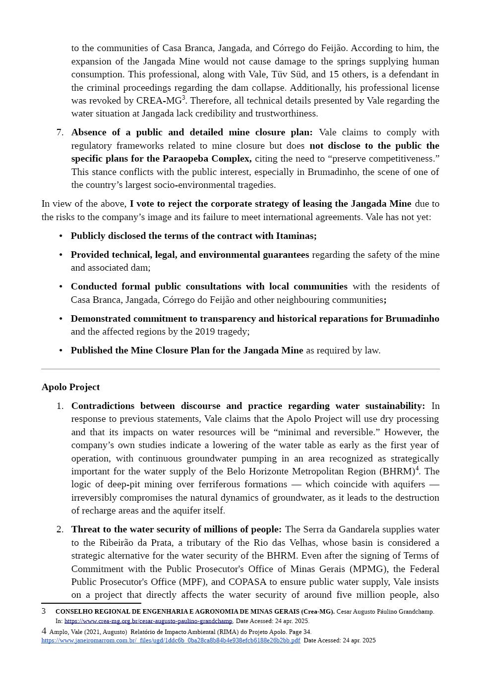 到Casa Branca、Jangada和C ó rrego do Feij ã o社区。据他介绍,Jangada矿的扩建不会对供应人类消费的弹簧造成损害。这名专业人士与淡水河谷、T ü v S ü d和其他15人一起,是有关大坝坍塌的刑事诉讼的被告。此外,他的职业执照被CREA-MG3吊销。因此,淡水河谷提出的关于Jangada水情况的所有技术细节都缺乏可信度和可信度。7.缺乏公开和详细的矿山关闭计划:淡水河谷声称遵守与矿山关闭相关的监管框架,但没有向公众披露Paraopeba综合体的具体计划,理由是需要“保持竞争力”。这一立场与公众利益相冲突,尤其是在该国最大的社会环境悲剧之一的布鲁马迪尼奥。鉴于上述情况,鉴于公司形象存在风险,且未能满足国际协议,本人投票否决了租赁Jangada矿的公司战略。淡水河谷尚未:•公开披露与Itaminas的合同条款;•就矿山和相关大坝的安全提供技术、法律和环境保障;•与Casa Branca、Jangada、C ó rrego do Feij ã o和其他邻近社区的居民进行了与当地社区的正式公众协商;•表现出对2019年悲剧对Brumadinho和受影响地区的透明度和历史赔偿的承诺;•根据法律要求公布了Jangada矿山的矿山关闭计划。Apolo项目1。关于水可持续性的讨论与实践之间的矛盾:针对此前的声明,淡水河谷声称,Apolo项目将使用干法加工,其对水资源的影响将“最小且可逆转”。然而,该公司自己的研究表明,早在运营的第一年就降低了地下水位,在一个被认为对贝洛奥里藏特都会区(BHRM)4的供水具有战略重要性的地区持续抽取地下水。在含铁地层上进行深坑开采的逻辑——这与含水层不谋而合——不可逆转地损害了地下水的自然动态,因为它导致了补给区和含水层本身的破坏。2.对数百万人水安全的威胁:Serra da Gandarela向Rio das Velhas的支流Ribeir ã o da Prata供水,该流域被认为是BHRM水安全的战略替代方案。即使在与米纳斯吉拉斯州检察官办公室(MPMG)、联邦检察官办公室(MPF)、COPASA签署承诺条款以确保公共供水后,淡水河谷仍坚持一个直接影响约500万人的水安全的项目,也是3 CONSELHO Regional de Engenharia e AGRONOMIA de MINAS GERAIS(Crea-MG)。Cesar Augusto P á ulino Grandchamp。在:https://www.crea-mg.org.br/cesar-augusto-paulino-grandchamp。访问日期:2025年4月24日。4 Amlo,淡水河谷(2021,Augusto)Relat ó rio de Impacto Ambiental(RIMA)do Projeto Apolo。第34页。https://www.janeiromarrom.com.br/_files/ugd/1ddc6b_0ba28ca8b84b4e938efcb6188e26b2bb.pdf访问日期:2025年4月24日