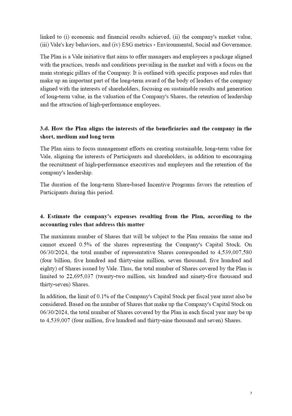 与(i)取得的经济和财务成果、(ii)公司市值、(iii)淡水河谷的关键行为、以及(iv)ESG指标——环境、社会和治理相关。该计划是淡水河谷的一项举措,旨在为管理人员和员工提供与市场上普遍存在的做法、趋势和条件相一致的一揽子计划,并将重点放在公司的主要战略支柱上。它以具体的宗旨和规则概述,构成长期奖励与股东利益一致的公司领导机构的重要组成部分,侧重于可持续的结果和长期价值的产生,在公司股票的估值、保持领导地位和吸引高绩效员工方面。3.d。该计划如何在短期、中期和长期内使受益人和公司的利益保持一致该计划旨在将管理工作的重点放在为淡水河谷创造可持续的长期价值上,使参与者和股东的利益保持一致,此外还鼓励招聘高绩效的高管和员工以及保留公司的领导层。长期股权激励计划的持续时间有利于在此期间保留参与者。4.估算该计划导致的公司费用,根据处理该事项的会计规则,将受该计划约束的股份数量上限保持不变,且不能超过代表公司股本的0.5%的股份。于06/30/2024,代表股份总数对应淡水河谷已发行的4,539,007,580(四亿五亿三千九百万七千五百八十)股份。因此,该计划涵盖的股份总数限制为22,695,037(2,200万股,619.5万股和37)股。此外,还必须考虑每个会计年度公司股本的0.1%的限制。根据于06/30/2024组成公司股本的股份数目,该计划于每个财政年度所涵盖的股份总数最多可达4,539,007股(四百万股,五百三十九万零七股)。