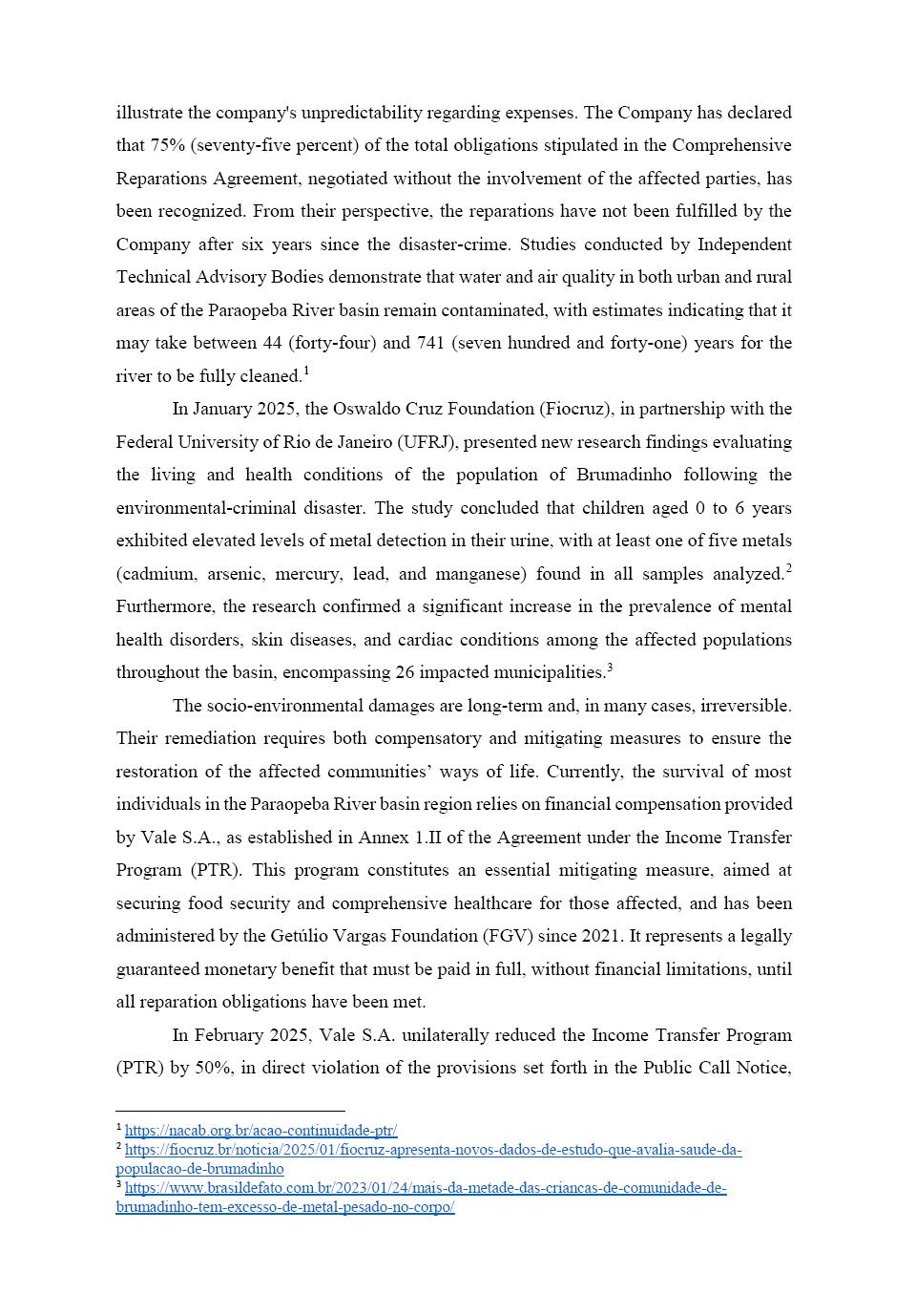 说明公司在费用方面的不可预测性。公司已声明,在不涉及受影响方的情况下协商达成的《全面赔偿协议》规定的总义务的75%(75%)已得到承认。从他们的角度来看,公司在灾难-犯罪发生六年后仍未履行赔偿。独立技术咨询机构进行的研究表明,Paraopeba河流域城市和农村地区的水和空气质量仍然受到污染,据估计,这条河可能需要44(44)至741(741)年才能完全被清理干净。1 2025年1月,Oswaldo Cruz基金会(Fiocruz)与里约热内卢联邦大学(UFRJ)合作,提出了新的研究结果,评估了Brumadinho居民在环境-刑事灾难后的生活和健康状况。研究得出的结论是,0至6岁的儿童尿液中的金属检测水平升高,在所有分析样本中至少发现了五种金属(镉、砷、汞、铅和锰)中的一种。2此外,研究证实,整个流域受影响人群的心理健康障碍、皮肤病和心脏病患病率显着增加,包括26个受影响的市镇。3社会环境损害是长期的,在许多情况下是不可逆转的。他们的补救需要补偿和缓解措施,以确保恢复受影响社区的生活方式。目前,Paraopeba河流域地区大多数个人的生存依赖于由淡水河谷公司提供的经济补偿,这一点在收入转移计划(PTR)下的协议附件1.II中有所规定。该计划是一项重要的缓解措施,旨在确保受影响者的粮食安全和全面医疗保健,自2021年以来一直由Get ú lio Vargas基金会(FGV)管理。它代表一种法律保证的货币利益,必须全额支付,没有财务限制,直到所有赔偿义务都得到满足。2025年2月,淡水河谷公司单方面将收入转移计划(PTR)减少50%,直接违反了公开征集通知中规定的规定,1 https://nacab.org.br/acao-continuidade-ptr/2 https://fiocruz.br/noticia/2025/01/fiocruz-apresenta-novos-dados-de-estudo-que-avalia-saude-dapopulacao-de-brumadinho 3 https://www.brasildefato.com.br/2023/01/24/mais-da-metade-das-criancas-de-comunidade-debrumadinho-tem-excesso-de-metal-pesado-no-corpo/