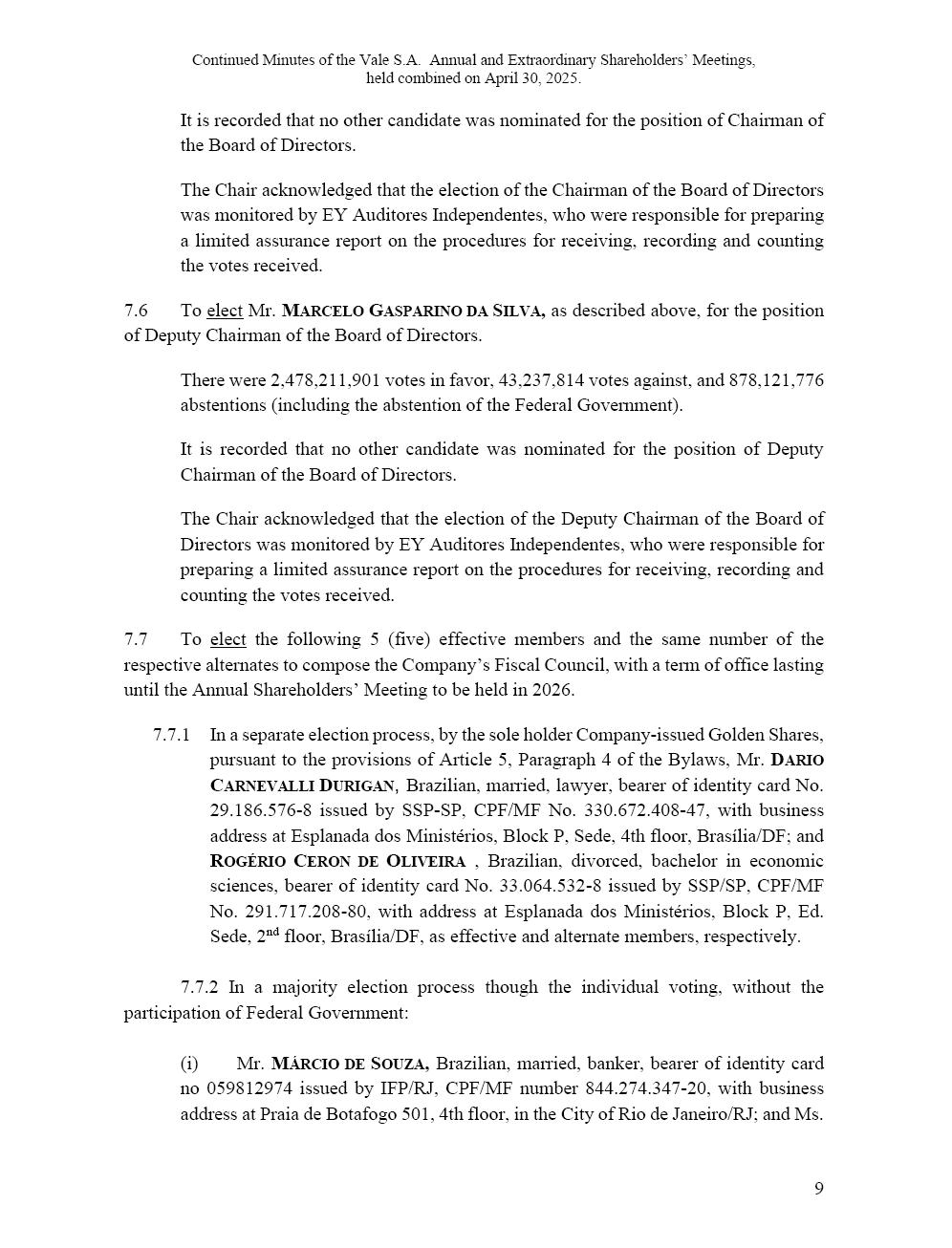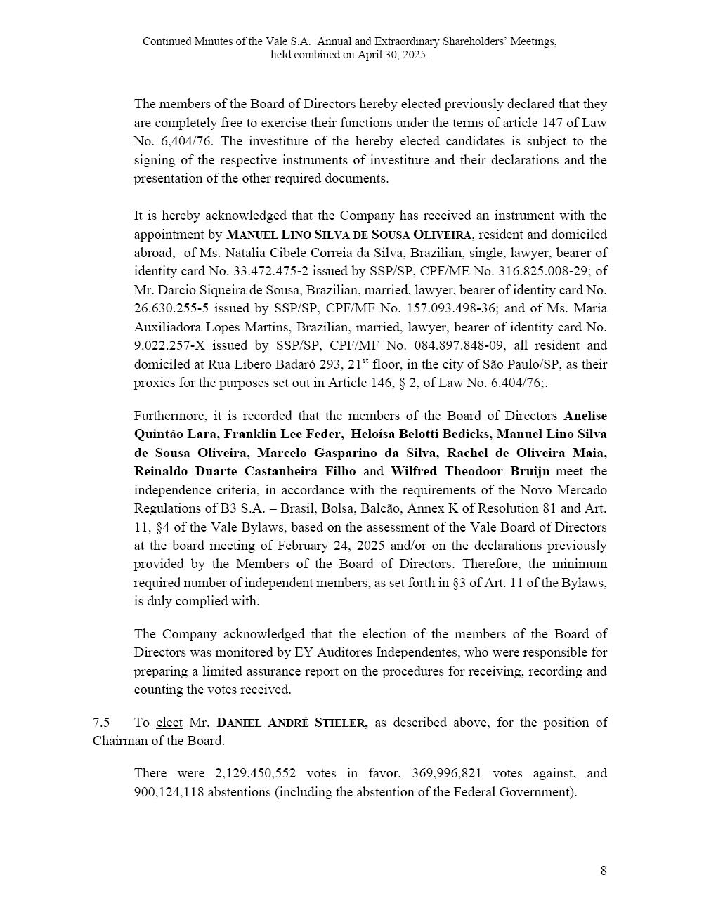 特此选出的董事会成员此前声明,根据第6404/76号法律第147条的规定,他们完全可以自由行使职能。特此选出的候选人的授勋以签署各自的授勋文书及其声明和出示其他所需文件为准。特此确认,公司收到MANUEL LINO SILVA DE SOUSA OLIVEIRA委任的文书,居民及住所地在境外,Natalia Cibele Correia da Silva女士,巴西人,单身,律师,持有由SSP/SP签发的第33.472.475-2号身份证,CPF16.825.008-29号;Darcio Siqueira de Sousa先生,巴西人,已婚,律师,持有由SSP/SP签发的第26.630.255-5号身份证,TERM3/MF第157.093.498-36号;及Maria Auxiliadora Lopes Martins女士,巴西人,已婚,律师,持有签发的第9.022.257-X号身份证所有居民和住所位于圣保罗/SP市21楼Rua L í bero Badar ó 293的人,作为第6.404/76号法律第146条第2款规定的目的的代理人;此外,据记载,根据B3 S.A. – Brasil、Bolsa、Balc ã o、第81号决议附件K和淡水河谷章程第11条第4款的要求,根据淡水河谷董事会在2月24日董事会会议上的评估,董事会成员Anelise Quint ã o Lara、Franklin Lee Feder、Helo í sa Belotti Bedicks、Manuel Lino Silva de Sousa Oliveira、Marcelo Gasparino da Silva、Rachel de Oliveira Maia、Reinaldo Duarte Castanheira Filho和Wilfred Theodoor Bruijn符合独立性标准,2025年和/或根据董事会成员先前提供的声明。因此,章程第11条第3款规定的独立成员最低要求人数得到适当遵守。该公司承认,董事会成员的选举由安永独立审计员监督,他们负责就收到的投票的接收、记录和计票程序编制一份有限保证报告。7.5如上文所述,选举DANIEL ANDR é STIELer先生担任董事会主席一职。2,129,450,552票赞成,369,996,821票反对,900,124,118票弃权(其中联邦政府弃权)。