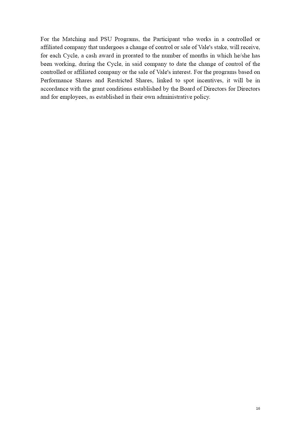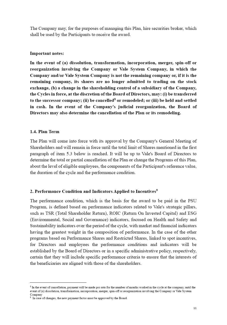公司可为管理本计划的目的,聘请证券经纪人,由参与者用于领取奖励。重要提示:如果发生(a)涉及公司或淡水河谷系统公司的解散、转型、成立为公司、合并、分拆或重组,其中公司和/或淡水河谷系统公司不是剩余公司,或者,如果是剩余公司,则其股份不再获准在证券交易所交易,(b)公司子公司的股权控制权发生变化,则董事会可酌情决定有效的周期:(i)转让给继任公司;(ii)被注销8或改造;或(iii)以现金持有和结算。如果公司发生司法重整,董事会也可以决定取消该计划或对其进行重塑。1.4.计划期限本计划经公司股东大会批准后生效,有效期至达到下文第5.3项第一段所述股份总额限制之日止。将由淡水河谷董事会决定是否全部或部分取消该计划或改变该计划的方案,有关合格雇员的水平、参与者参考价值的组成部分、周期的持续时间和绩效条件。2.绩效条件和适用于激励的指标9绩效条件是PSU计划中支付奖励的基础,其定义基于与淡水河谷战略支柱相关的绩效指标,如TSR(股东总回报)、ROIC(投资资本回报率)和ESG(环境、社会和治理)指标,重点关注周期期间的健康和安全以及可持续发展指标,市场和财务指标在业绩构成中的权重最大。在其他基于绩效股份和限制性股票的方案中,与现货激励挂钩,针对董事和员工的绩效条件和指标将分别由董事会或在特定的行政政策中确定,确定它们将包括特定的绩效标准,以确保受益人的利益与股东的利益保持一致。8在取消的情况下,将按周期内在公司工作的月数按比例付款,直至(a)涉及公司或淡水河谷系统公司的解散、转型、成立、合并、分拆或重组事件9发生变化时,新的付款系数必须经董事会批准。