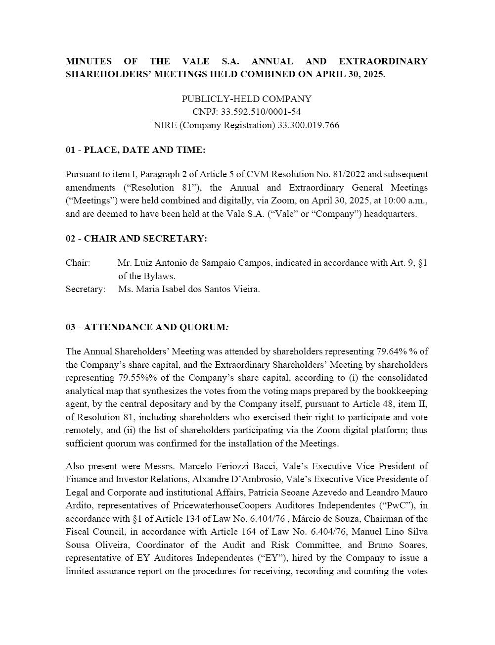 会议记录:VALE S.A.年度股东大会和特别股东大会于2025年4月30日举行。上市公司CNPJ:33.59 2.510/0001-54 NIRE(公司注册)33.30 0.01 9.76 601-地点、日期和时间:根据CVM第81/2022号决议和随后的修订(“第81号决议”)第I项第5条第2款,年度股东大会和临时股东大会(“会议”)于2025年4月30日上午10:00通过Zoom以数字方式合并举行,并被视为已在淡水河谷公司(“淡水河谷”或“公司”)总部举行。02-主席兼秘书:主席:Luiz Antonio de Sampaio Campos先生,根据《章程》第9条第1款注明。秘书:玛丽亚·伊莎贝尔·多斯桑托斯·维埃拉女士。03-出席情况及法定人数:年度股东大会由代表公司股本79.64%%的股东出席,临时股东大会由代表公司股本79.55%%的股东出席,根据(i)根据第81号决议第四十八条第二项规定,由簿记管理人、中央存管人和公司本身编制的综合分析图,其中包括行使远程参与和投票权利的股东,(ii)通过Zoom数字平台参与的股东名单;因此确认了安装会议的足够法定人数。出席会议的还有淡水河谷财务和投资者关系执行副总裁Marcelo Feriozzi Bacci、淡水河谷法律、公司和机构事务执行副总裁Alxandre D’Ambrosio、普华永道会计师事务所(“普华永道”)的代表Patricia Seoane Azevedo和Leandro Mauro Ardito,根据第6.404/76号法律第134条第1款,财政委员会主席M á rcio de Souza,根据第6.404/76号法律第164条,审计和风险委员会协调员Manuel Lino Silva Sousa Oliveira,以及安永独立审计员(“安永”)的代表Bruno Soares,受聘公司出具有限责任鉴证报告的收票、记票、计票程序