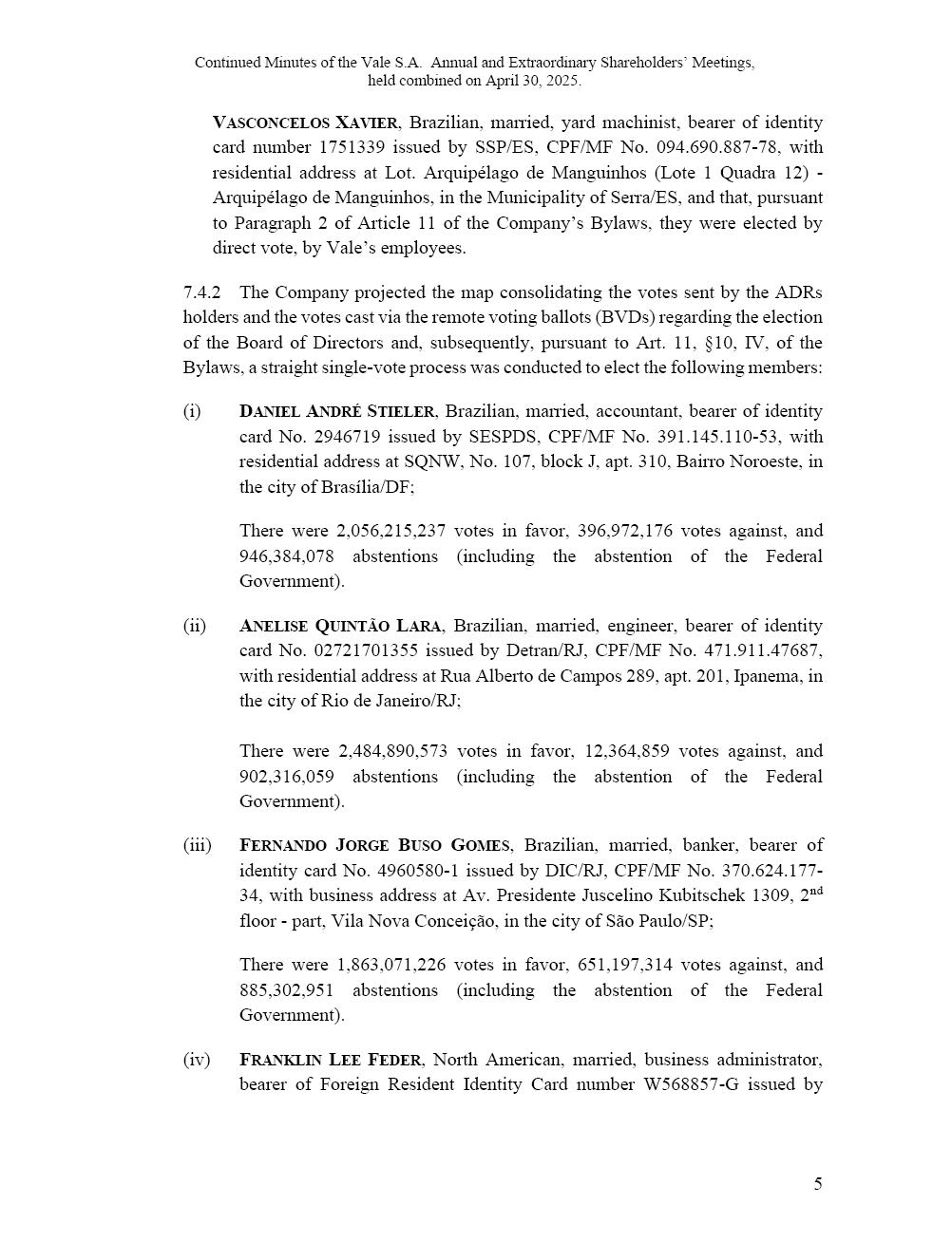 VASCONCELOS XAVIER,巴西人,已婚,庭院机械师,持有由SSP/ES签发的身份证号码1751339,丨CPF/MF编号094.690.887-78,居住地址在地段。Arquip é lago de Manguinhos(Lote 1 Quadra 12)-Arquip é lago de Manguinhos,位于Serra/ES市,根据公司章程第11条第2款,他们由淡水河谷的员工以直接投票方式选出。7.4.2公司预测了合并ADR持有人发送的投票和通过远程投票投票(BVD)就董事会选举所投的选票的地图,随后,根据章程第11条第10款第4款,进行了直接单票程序以选举以下成员:(i)Daniel ANDR é STIELer,巴西人,已婚,会计师,持有由SESPDS签发的第2946719号身份证,CPF/MF编号391.145.110-53,居住地址为SQNW,No. 107,J座,Bairro Noroeste,位于巴西利亚/DF市,310 apt.;有2,056,215,237票赞成,反对396,972,176票,弃权946,384,078票(其中联邦政府弃权)。(ii)ANELISE QUINT ã o LARA,巴西人,已婚,工程师,持有Detran/RJ签发的第02721701355号身份证,CPF/MF编号471.91 1.47687,居住地址为Rua Alberto de Campos 289,apt. 201,Ipanema,in the city of Rio de de Janeiro/RJ;得票数为2,484,890,573票赞成,12,364,859票反对,902,316,059票弃权(其中联邦政府弃权)。(iii)Fernando JORGE BUSO GOMES,巴西人,已婚,银行家,持有DIC/RJ签发的第4960580-1号身份证,CPF/MF第370.624.177-34号,营业地址为AV。总统Juscelino Kubitschek 1309,2nd floor-part,Vila Nova Concei çã o,S ã o Paulo/SP市;1,863,071,226票赞成,651,197,314票反对,885,302,951票弃权(包括联邦政府的弃权)。(iv)Franklin LEE FEDER,北美籍,已婚,业务管理员,持有外国居民身份证号码W568857-G由