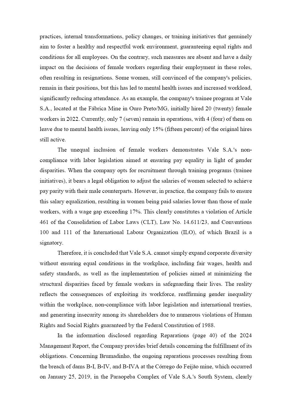 真正旨在培养健康和尊重的工作环境的做法、内部转型、政策变化或培训举措,保障所有员工的平等权利和条件。相反,这类措施缺乏,每天都会对女性工人关于她们担任这些角色的决定产生影响,经常导致辞职。一些女性,仍然对公司的政策深信不疑,仍然留在她们的岗位上,但这导致了心理健康问题和工作量增加,显着降低了出勤率。例如,该公司在淡水河谷公司的实习生项目位于Ouro Preto/MG的F á brica矿,2022年最初雇用了20(20)名女工。目前,仅有7人(7人)仍在运营,其中4人(4人)因心理健康问题休假,仅剩15%(15%)的原聘人员仍在工作。女工的不平等包容表明了淡水河谷公司不遵守旨在确保鉴于性别差异的薪酬平等的劳动法。当公司选择通过培训计划(受训人员倡议)进行招聘时,它承担着调整被选中的女性薪酬以实现与男性同行薪酬平等的法律义务。然而,在实践中,该公司未能确保这种薪酬均等,导致女性获得的薪酬低于男性工人,工资差距超过17%。这显然违反了《综合劳动法》(CLT)第461条、第14.611/23号法律以及巴西为签署国的国际劳工组织(ILO)第100号和第111号公约。因此,得出的结论是,如果不确保工作场所的平等条件,包括公平工资、健康和安全标准,以及实施旨在最大限度减少女工在保障其生命安全方面面临的结构性差异的政策,淡水河谷公司就不能简单地扩大公司多样性。现实情况反映了剥削其劳动力、重申工作场所内的性别不平等、不遵守劳动法和国际条约以及由于大量侵犯1988年《联邦宪法》保障的人权和社会权利而在其股东中产生不安全感的后果。在2024年管理报告披露的有关赔偿的信息(第40页)中,公司提供了有关履行义务的简要细节。关于Brumadinho,2019年1月25日发生在淡水河谷公司 South System的Paraopeba Complex的C ó rrego do Feij ã o矿的B-I、B-IV和B-IVA大坝破裂导致的正在进行的赔偿过程,显然
