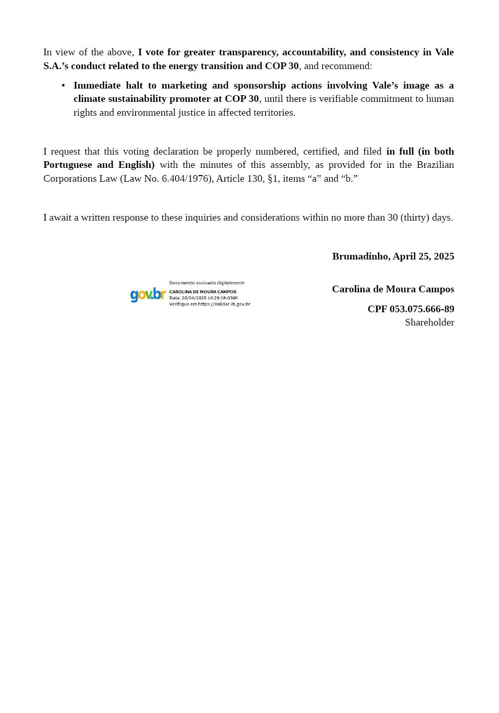 有鉴于此,我投票赞成在淡水河谷公司与能源转型和COP30相关的行为中提高透明度、问责制和一致性,并建议:•立即停止涉及淡水河谷在COP30上作为气候可持续性推动者形象的营销和赞助行动,直到对受影响地区的人权和环境正义作出可核查的承诺。我要求按照《巴西公司法》(第6.404/1976号法律)第130条第1款“a”和“b”项的规定,对这份投票声明进行适当编号、核证,并将其完整(以葡萄牙文和英文)与本次大会的会议记录一起归档。我等待不超过三十(三十)天内对这些询问和考虑的书面答复。Brumadinho,2025年4月25日Carolina de Moura Campos CPF 053.075.666-89股东情况